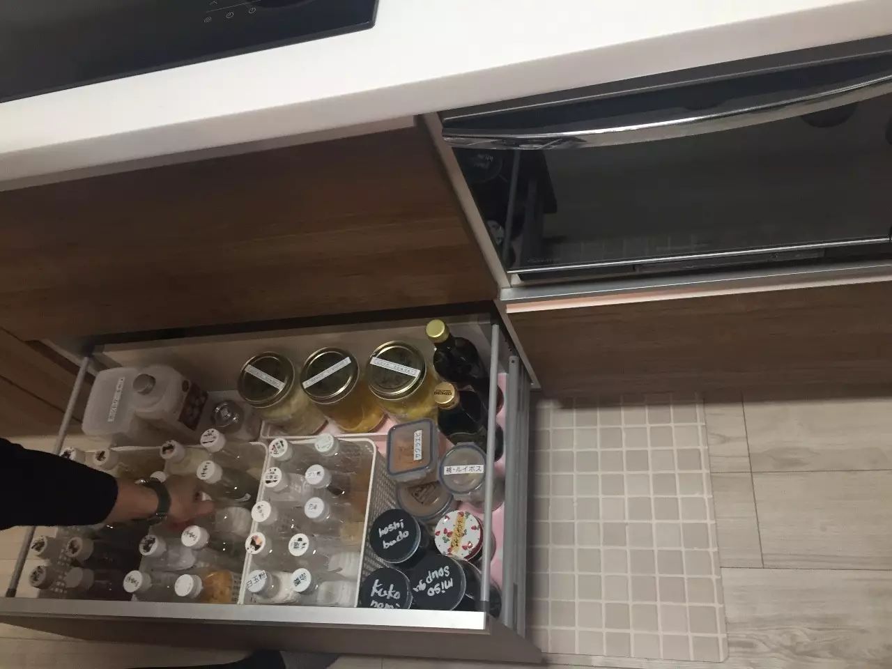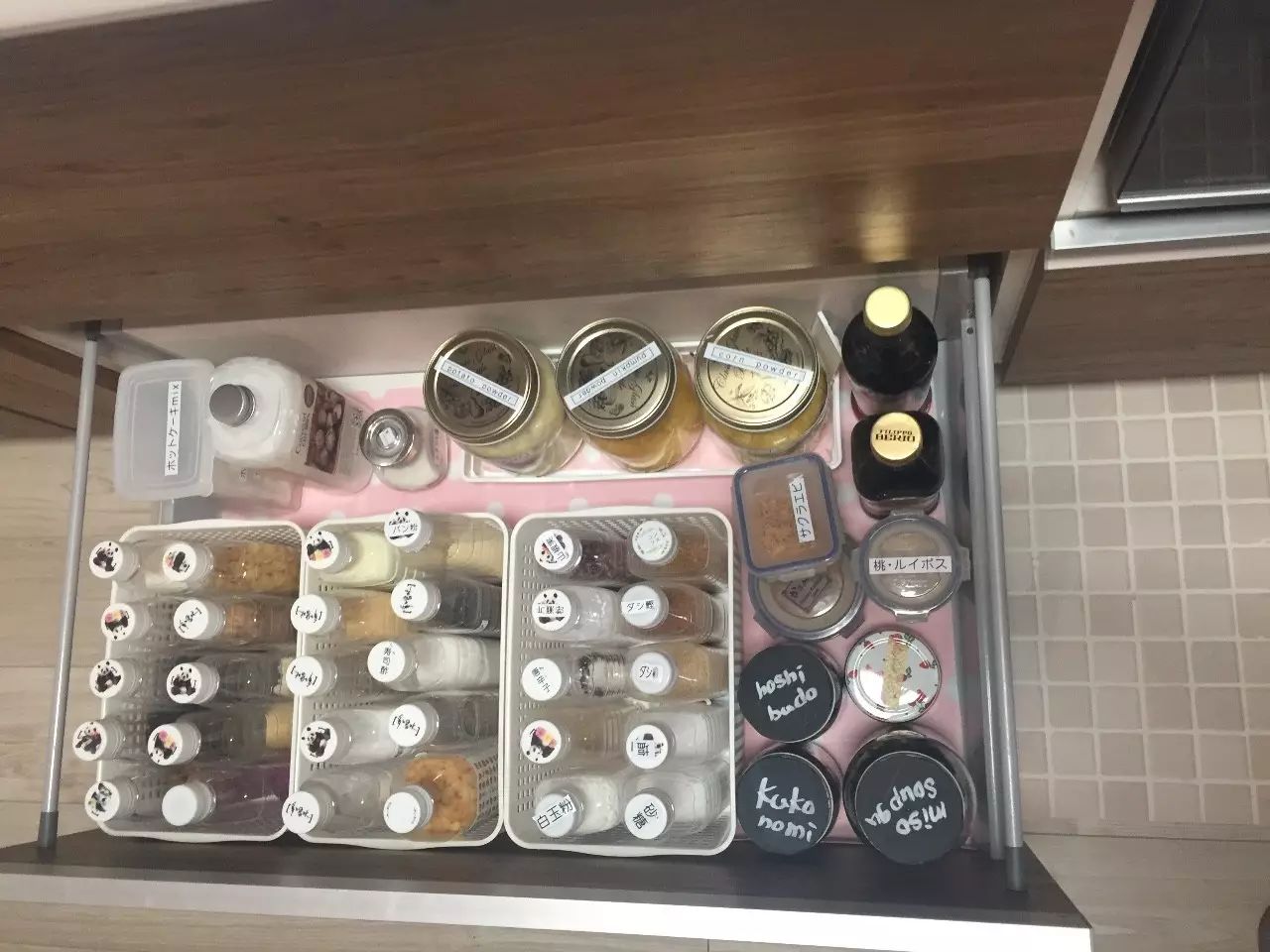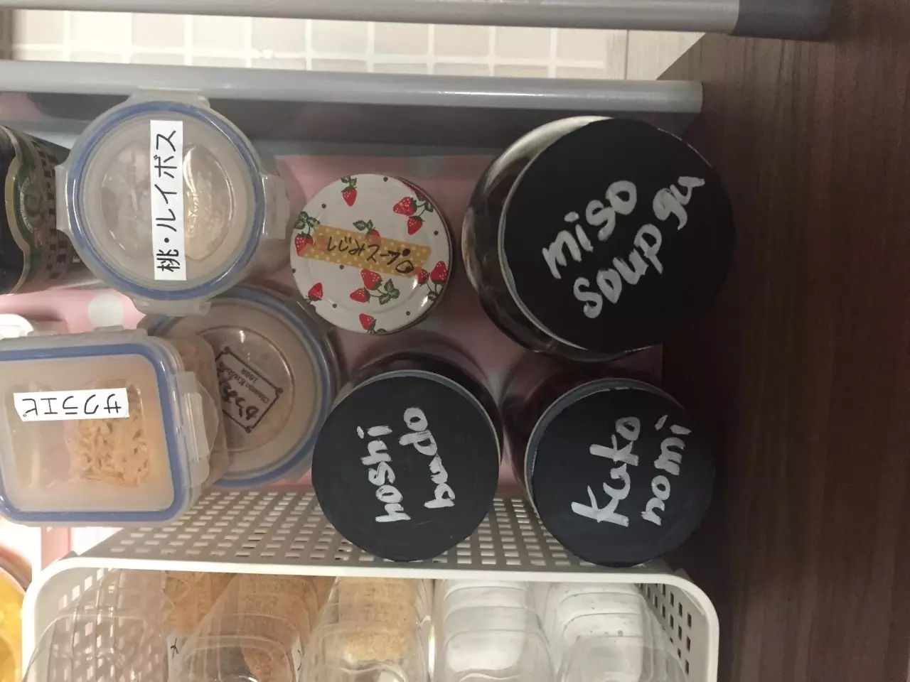 6、所有收纳瓶罐,在盖子上写明用途。如果想要视觉效果统一,可以采用一种黑色的环保涂料,将罐盖先统一涂成黑色,再用白色笔写上用途。