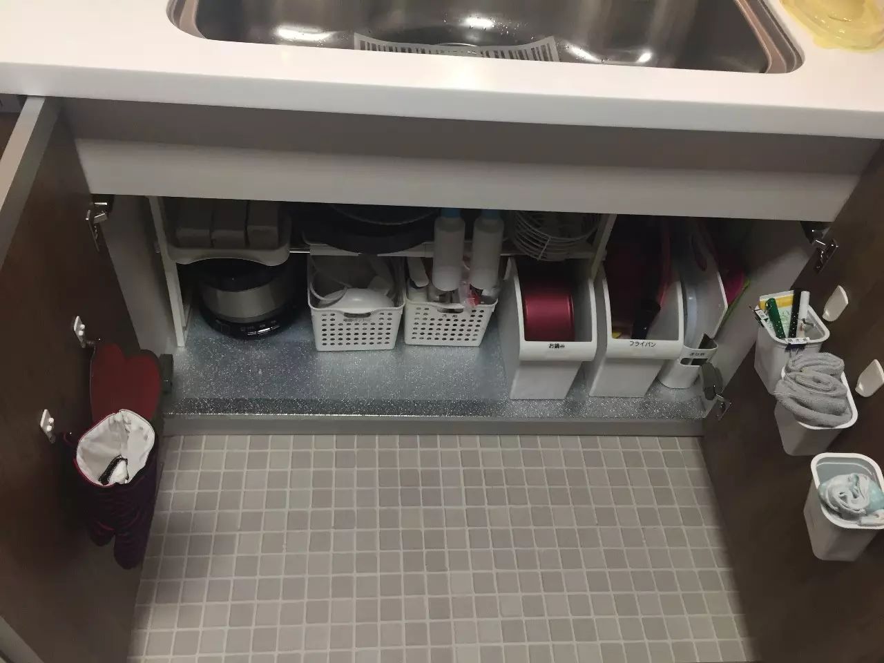 8、洗手池下方的空间,通过收纳工具巧妙组合,让厨房杂物,居有定所。亮点是右边柜门背面,挂着的是狗狗喝完的酸奶杯,用作收纳抹布和一些小杂碎。