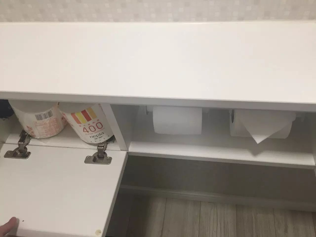 10、备用的卫生纸放在旁边看不见的柜子里。台面上可以放置手机等小物。