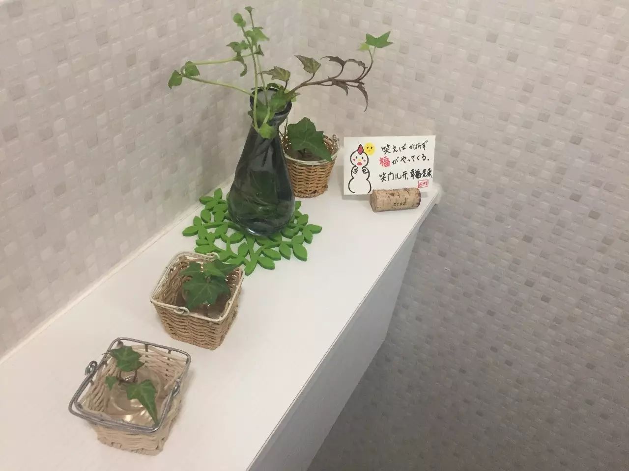 11、台面尽头,摆放着几盆绿植。亮点是一张池田老师的手绘卡。她说:日本人相信厕所里住着一个女神,是真的!