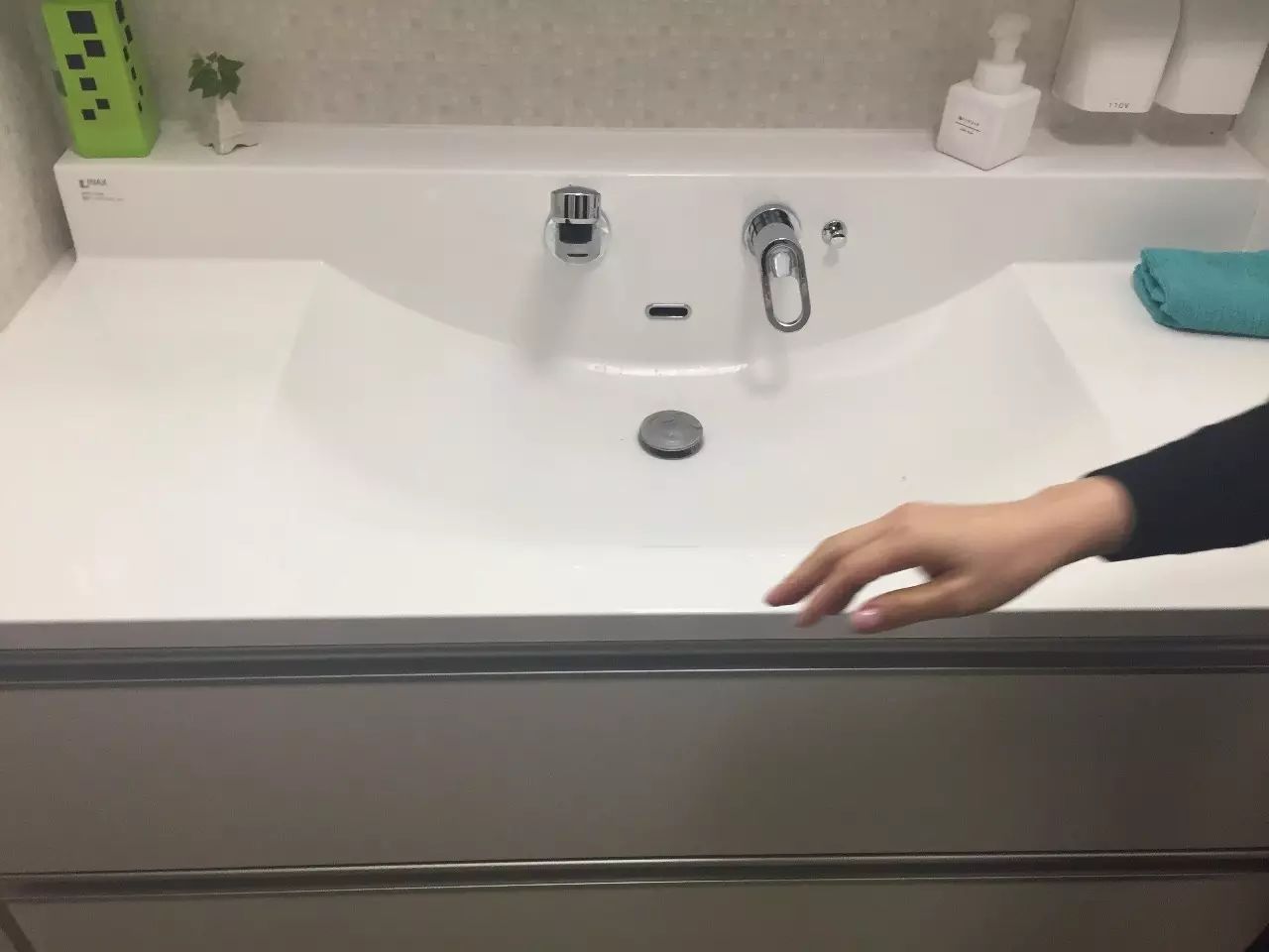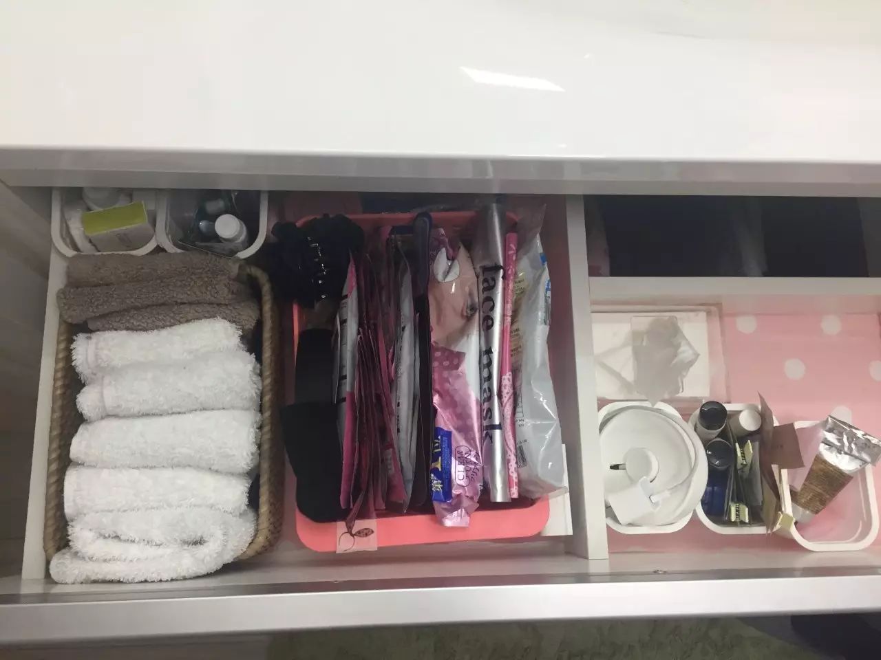 13、洗手台下方的抽屉里,摆放着很多池田老师的护肤美妆工具,大部分被安放在狗狗的酸奶杯里面。