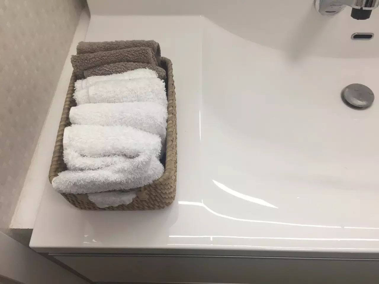 14、擦手小方巾被整齐叠放起来,放在一个篮筐里,取用很方便。