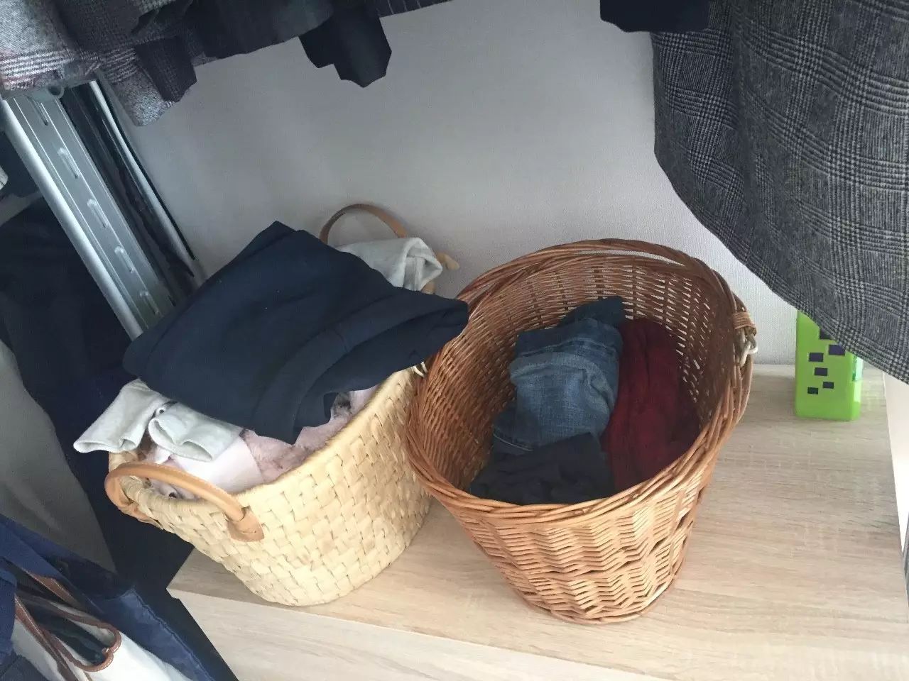 19 衣帽间里,居家服,以及穿过一次、无需马上清洗的衣服,分别放置在两个篮子里。