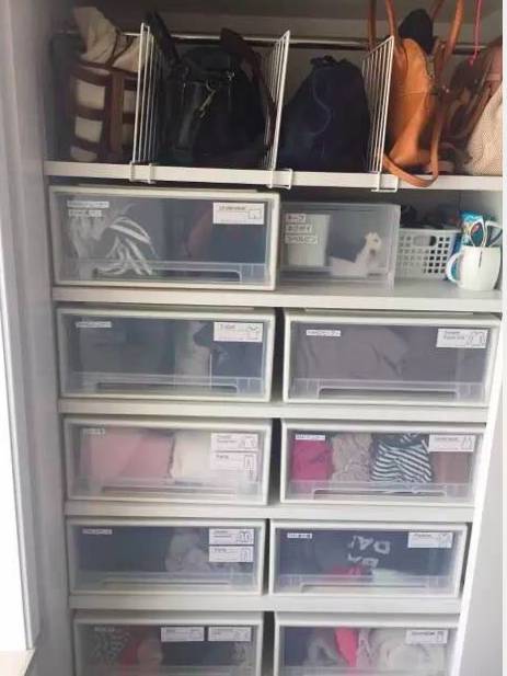 20、叠起来的衣服,全部收纳在透明抽屉收纳箱,俗称“PP箱”。贴上标签,使用时一目了然,大脑好轻松。