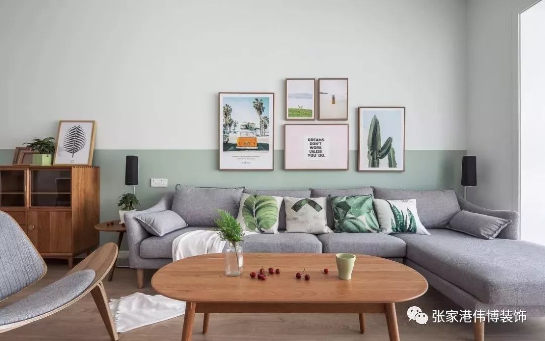 ▲灰色系的布艺沙发简约内敛,搭配北欧系绿色抱枕,增添了自然清新的味道。