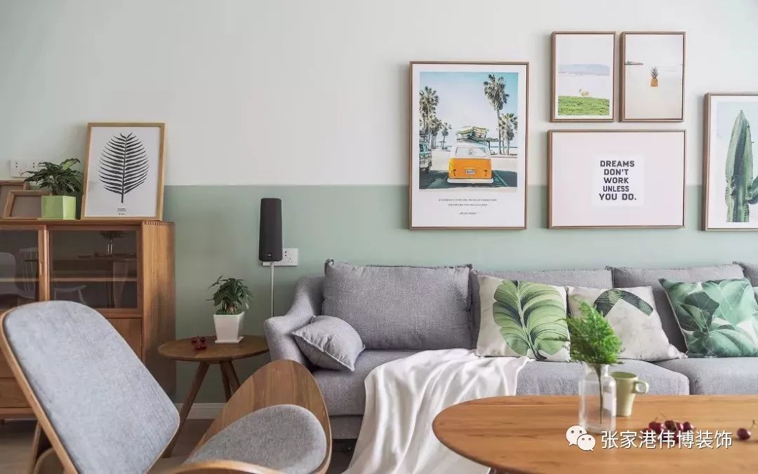 ▲墙面采用白色与浅绿色上下分色的涂刷效果,形成独特的围和感。