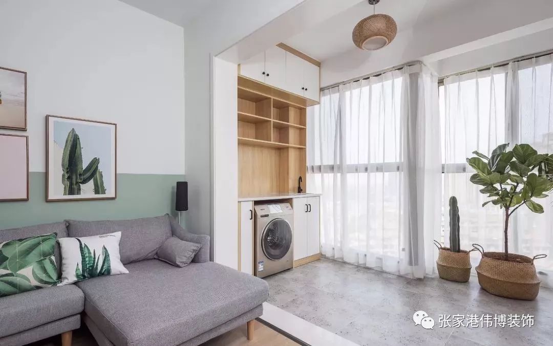▲阳台有超大的落地窗,简单的装饰了纱帘,朦胧飘逸。阳台除了存放洗衣机,还可以收纳清洁用品等各种杂物。