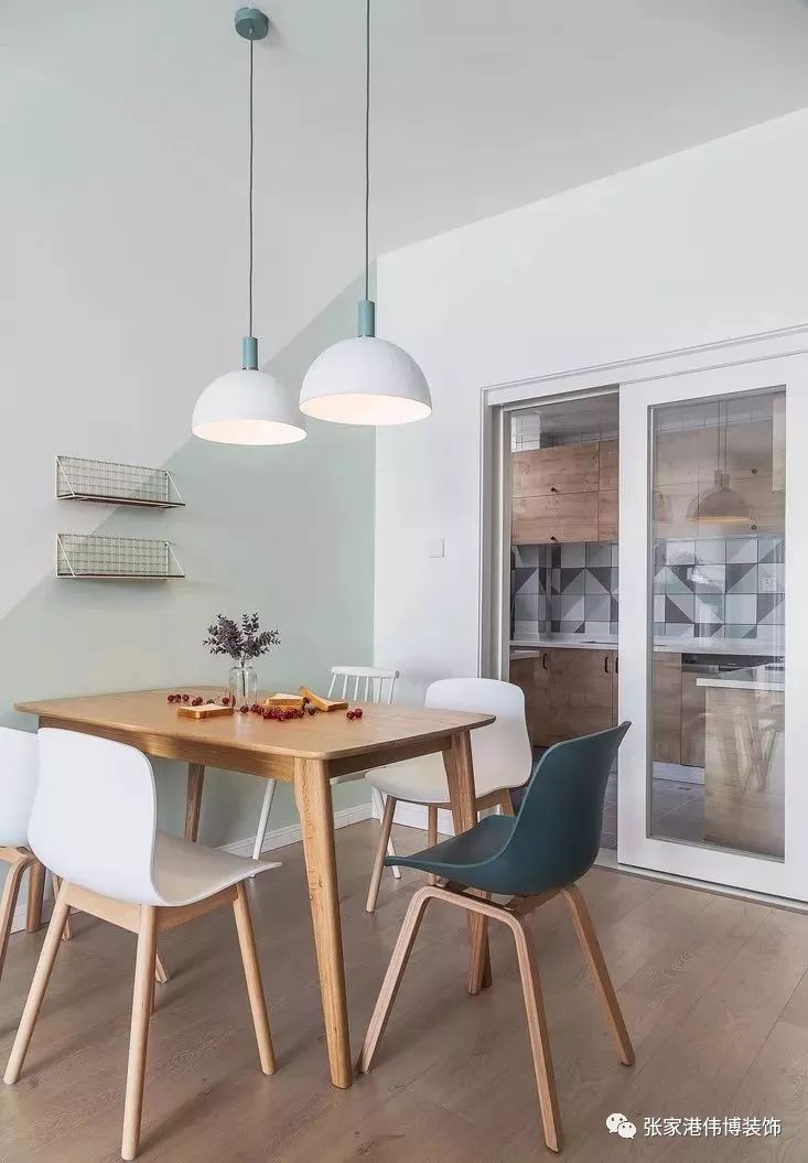 ▲餐厅延续客厅的风格,白绿分色的效果让空间色彩更加丰富。餐桌椅简约不简单,充满了温馨感。