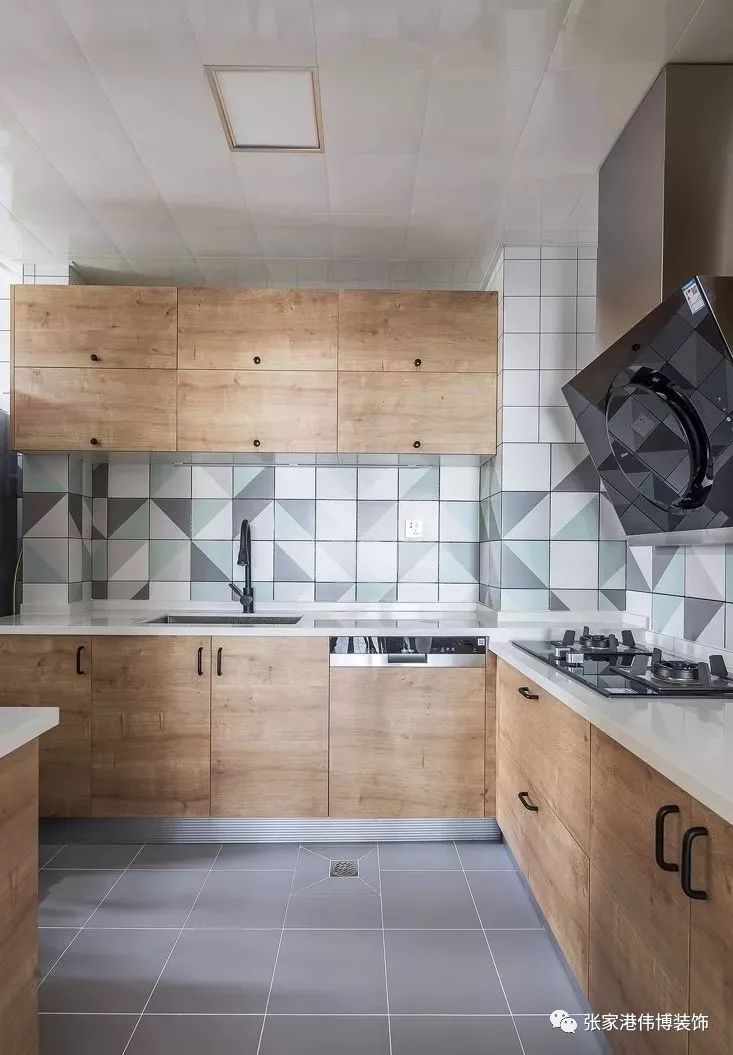 ▲厨房,白色+木色的橱柜纯净而温暖,墙面花砖的颜色也与空间主调中的白、绿、灰巧妙呼应,整体感觉自然清爽。