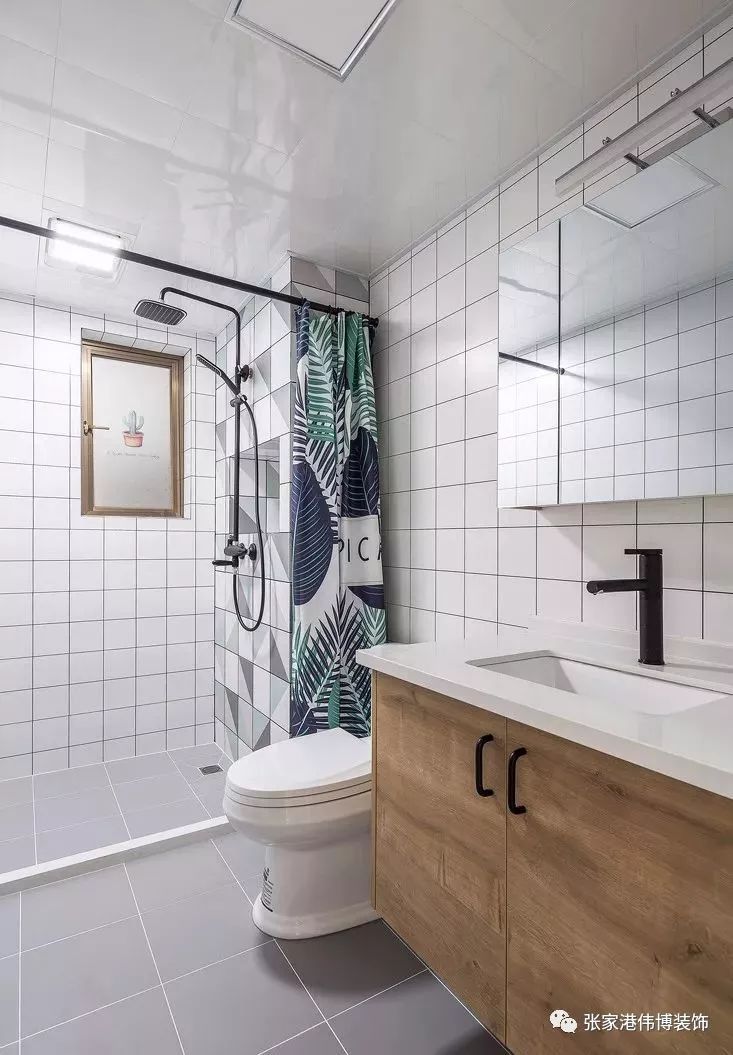 ▲卫生间墙地砖延续了厨房的风格,浴帘+挡水石的设计有效防止水溅到干区位置,让卫生间能够保持干爽整洁。