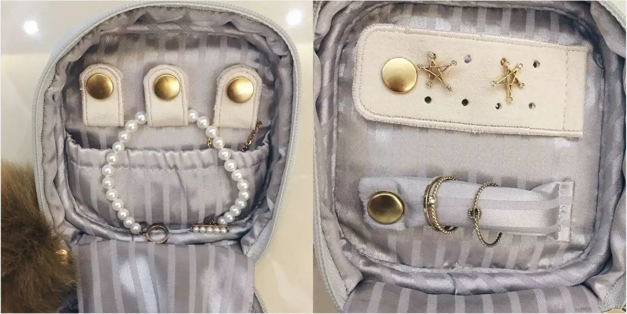 女孩子出门免不了打扮一番,不同的衣服要配不同的首饰,我会带上这个小巧的首饰包,多选几样我平常戴惯的戒指项链,有了固定的地方收纳,就不用担心会弄丢啦。