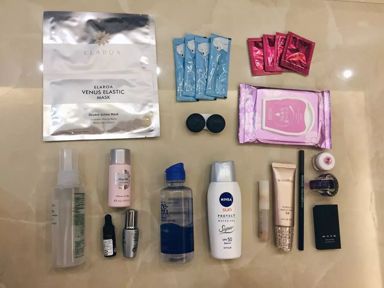 这是我这次带的2天量护肤品和化妆品,一般旅行的时候,相同功能的化妆品,我会优先选一些体积小或者一物多用的。
