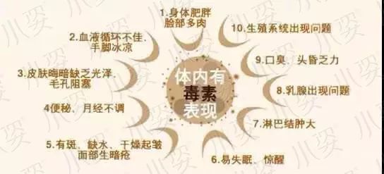 ①便秘;②痔疮;③肠炎; ④体臭口臭; ⑤面部浮肿、身材肥胖; ⑥长斑长痘、皮肤暗黄起皱 ;⑦月经不调;⑧妇科、乳腺疾病;⑨更年期提前; ⑩手脚冰凉,气血不足等等。