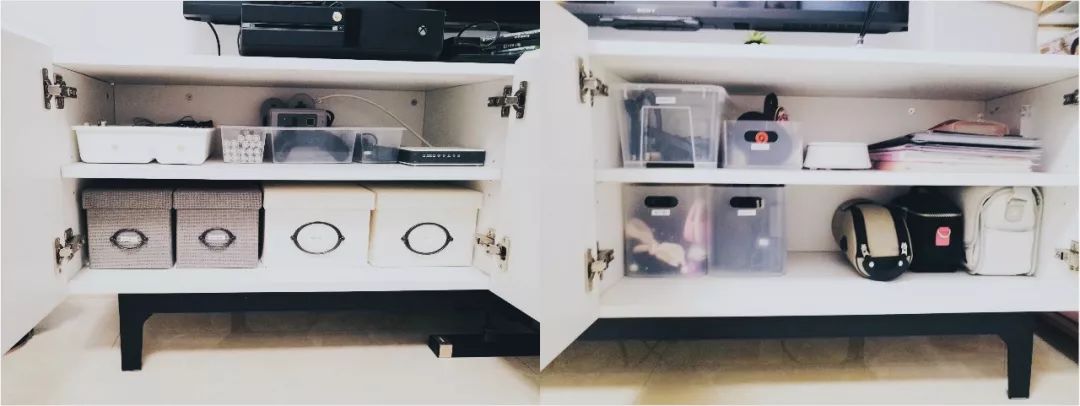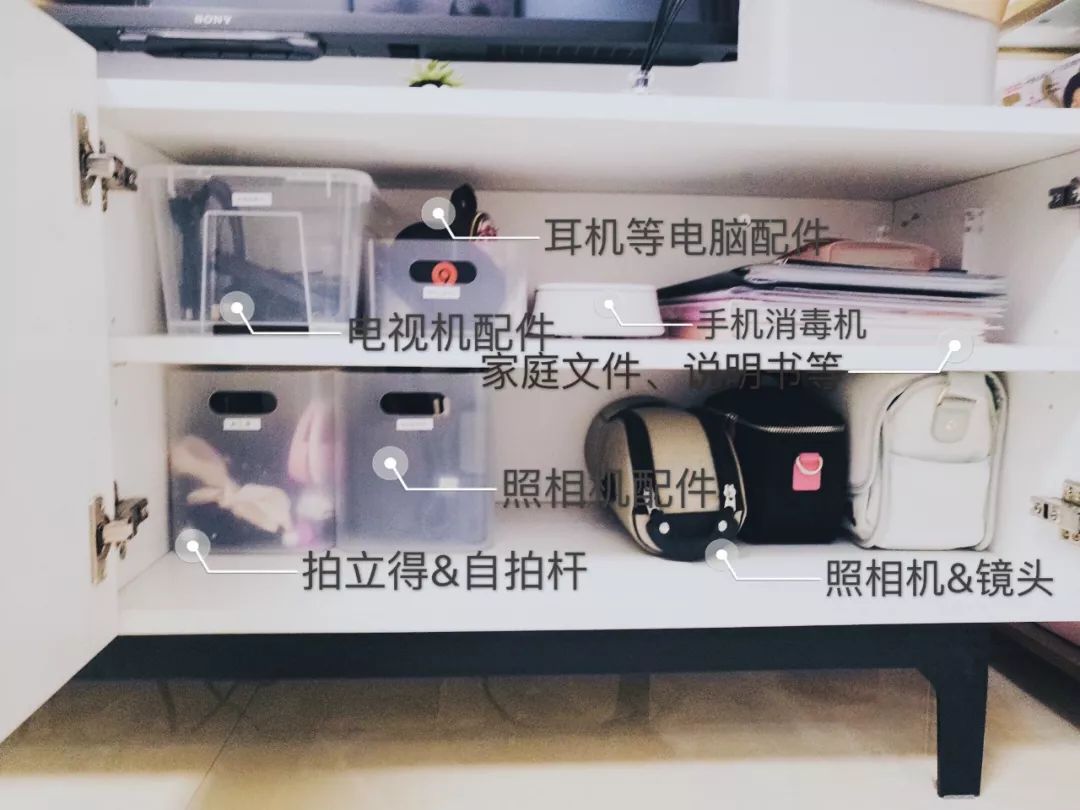 隐藏收纳的大功臣就是我家的电视柜,看起来不大,但却挺能装的。