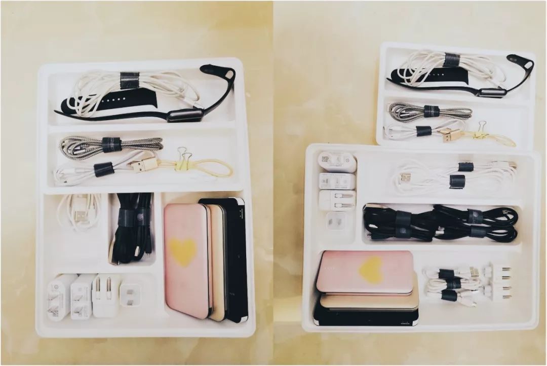 这个盒子很多功能,不仅能放数据线,还能收纳办公用品或者餐具。