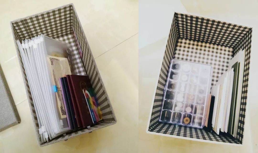 同样来自宜家的还有这两款带盖的收纳盒。左面放的是旅行相关的物品,右边是重要的票据和备用纽扣。