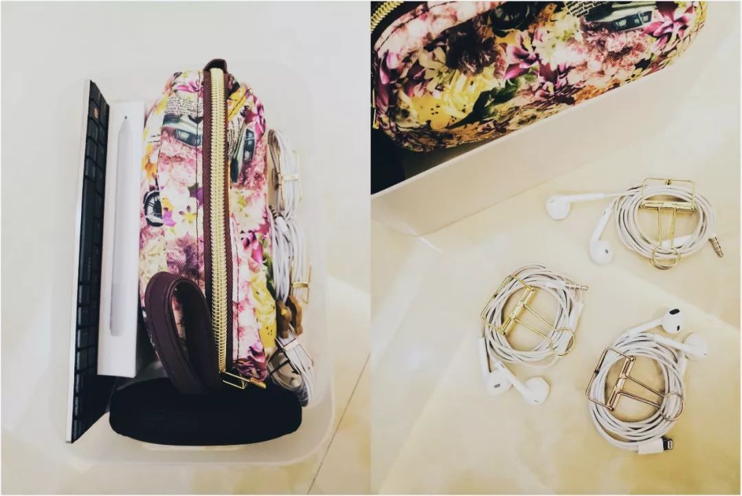 这个小盒子收纳的都是电脑相关物品,耳机用长尾夹收纳不会散。
