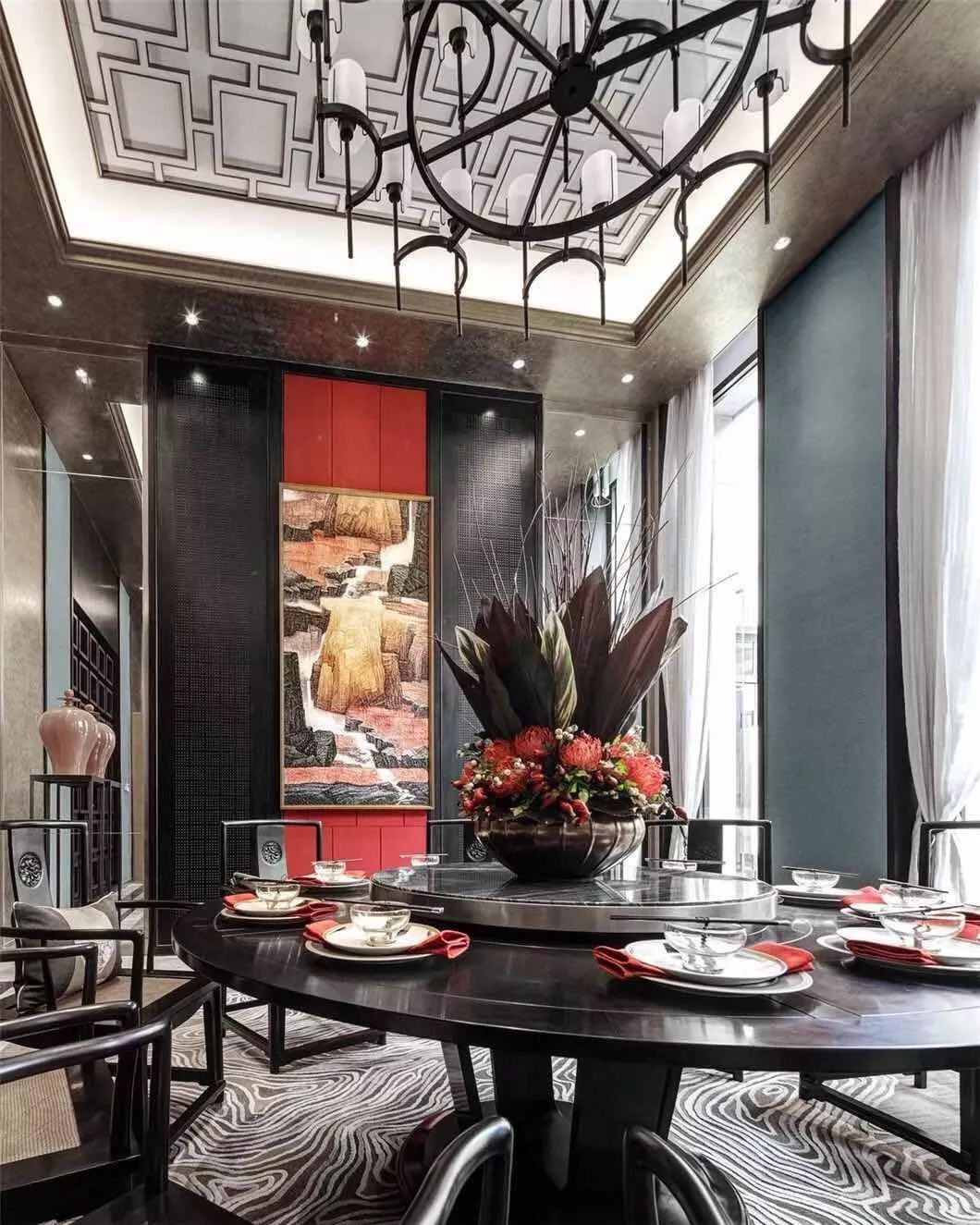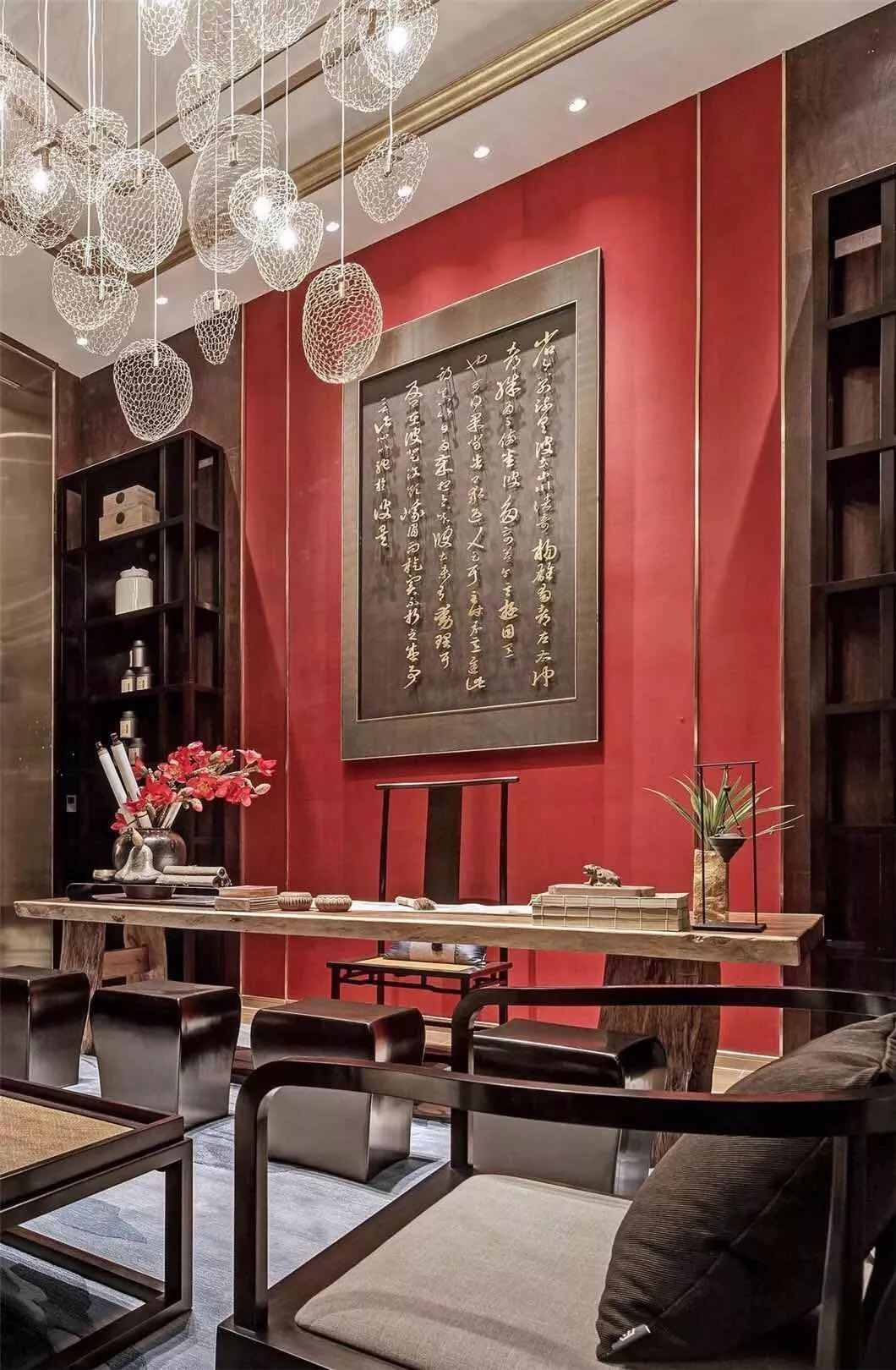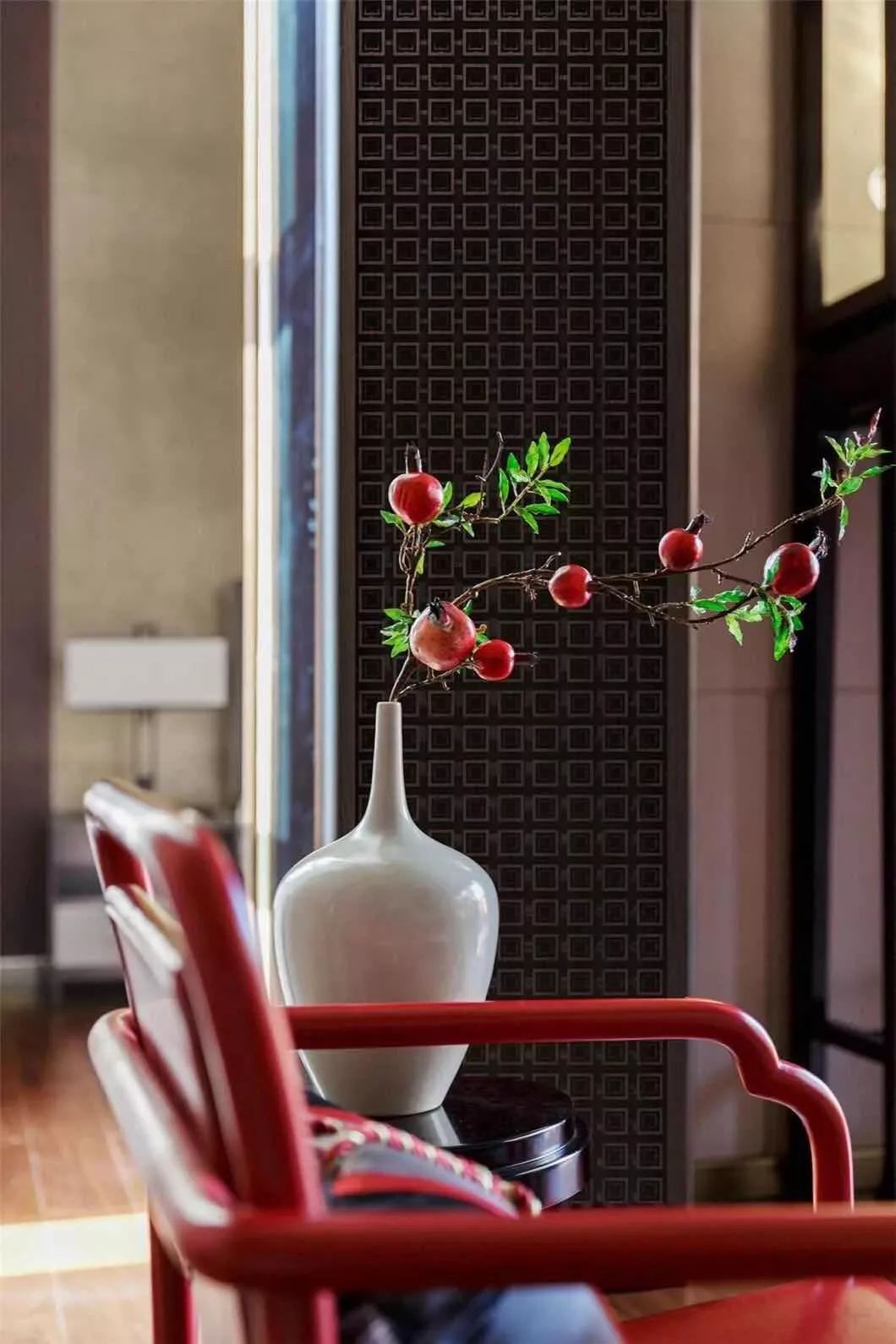 新中式设计既有中式传统的精致典雅又不失现代生活的舒适性中国红中国的国色流转着千年历史的神韵红色映入眼帘花艺作品巧妙地嵌入增添了东方古韵中餐厅的设计融入了现代简约型制借鉴了中国古典建筑艺术端庄大气小巧的花艺作品选用红色非常醒目自带高雅秀逸的气质花艺对于家的点缀让人找到内在回归内心平和满足新中式契合了