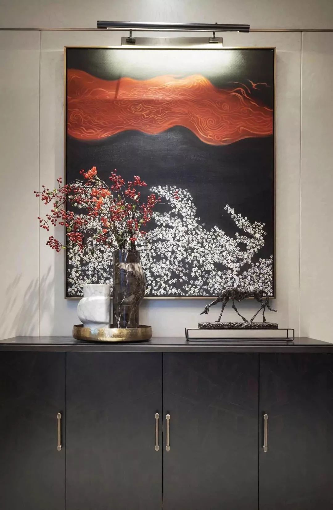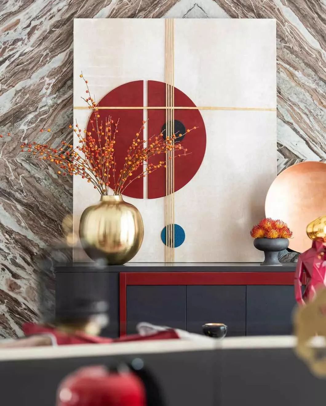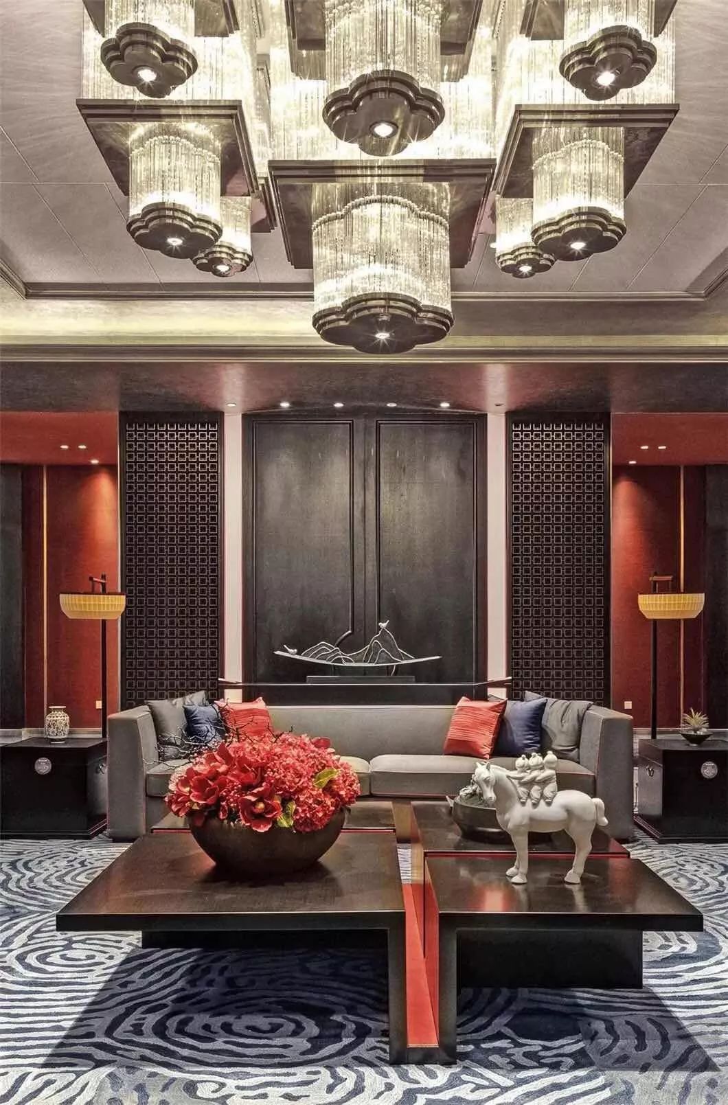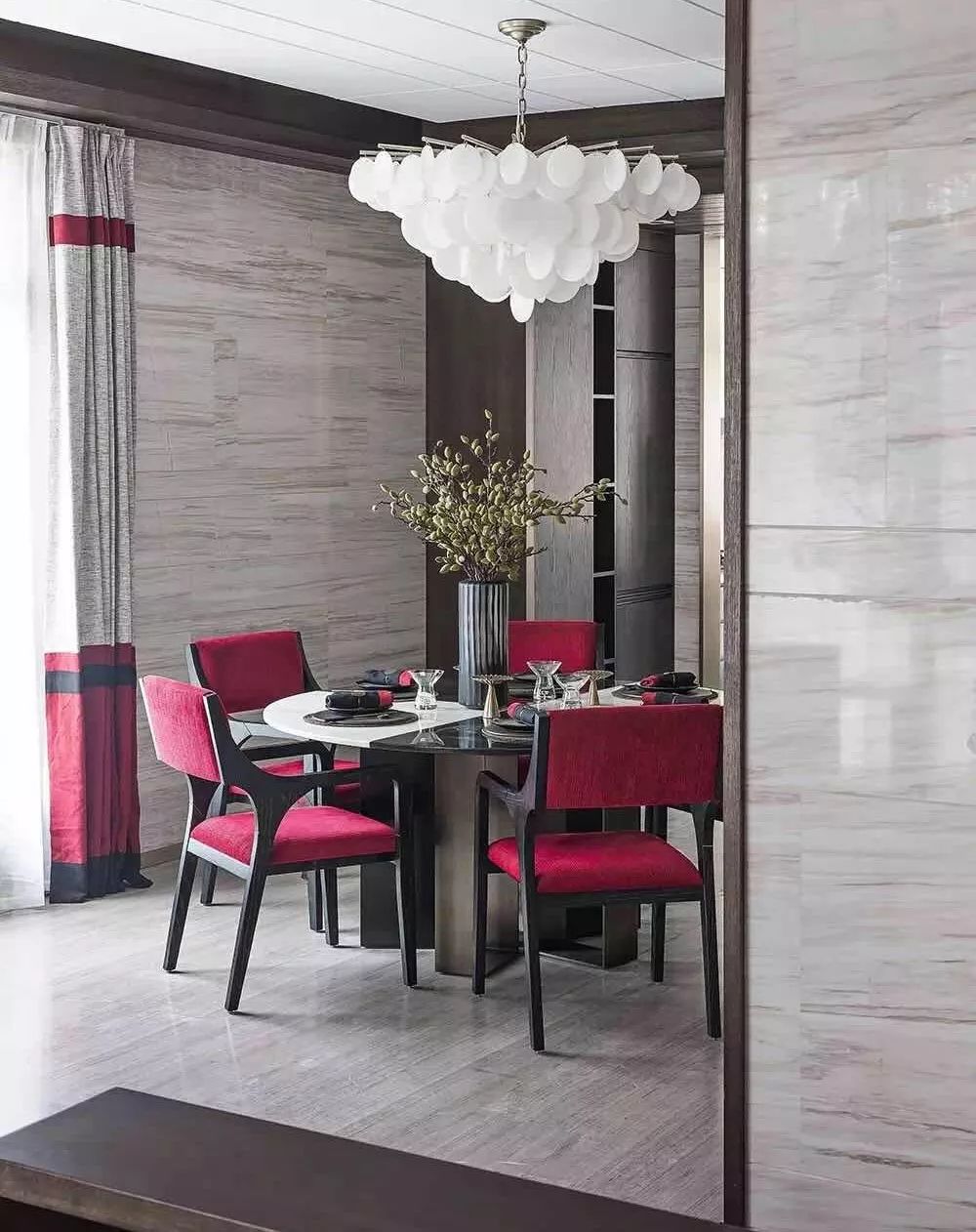 新中式设计既有中式传统的精致典雅又不失现代生活的舒适性中国红中国的国色流转着千年历史的神韵红色映入眼帘花艺作品巧妙地嵌入增添了东方古韵中餐厅的设计融入了现代简约型制借鉴了中国古典建筑艺术端庄大气小巧的花艺作品选用红色非常醒目自带高雅秀逸的气质花艺对于家的点缀让人找到内在回归内心平和满足新中式契合了
