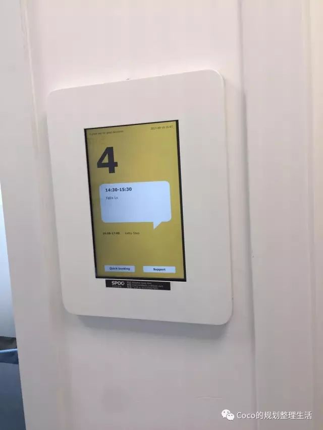 正式的会议会在会议室进行,每间会议室门口都有一个显示屏。可以查看会议室预订情况或者快速预订。Coco快速看了一下,从早到晚的会议室全部被预订的满满当当。