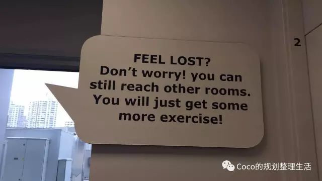 其实巨大的回字形楼面结构足以让来访者上演一出Lost in IKEA,不过设计师的这个提示牌足以让你露出会心一笑。