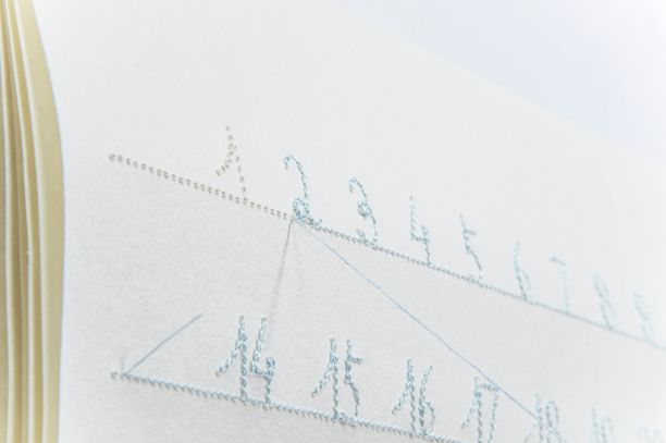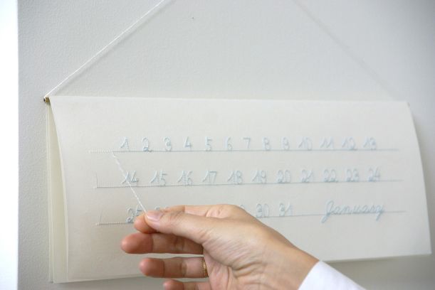 这本日历有些抒情:日期数字,是由一根淡蓝色的线串联而成。每一天逝去,就轻轻拉一下线,数字也随之消失,如同花朵般短暂易逝。