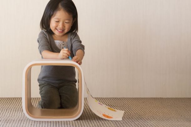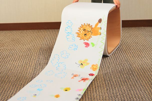 四方形的儿童桌,被画纸厚厚围住,孩子可以在纸上快乐涂鸦。画完就翻一下桌面,圆角的设计安全又容易翻转,非常方便。