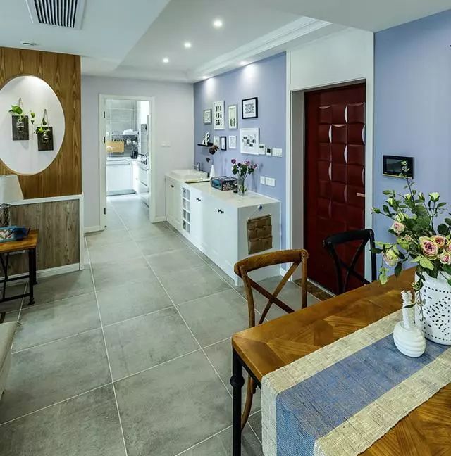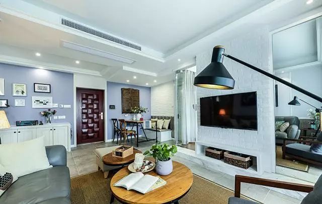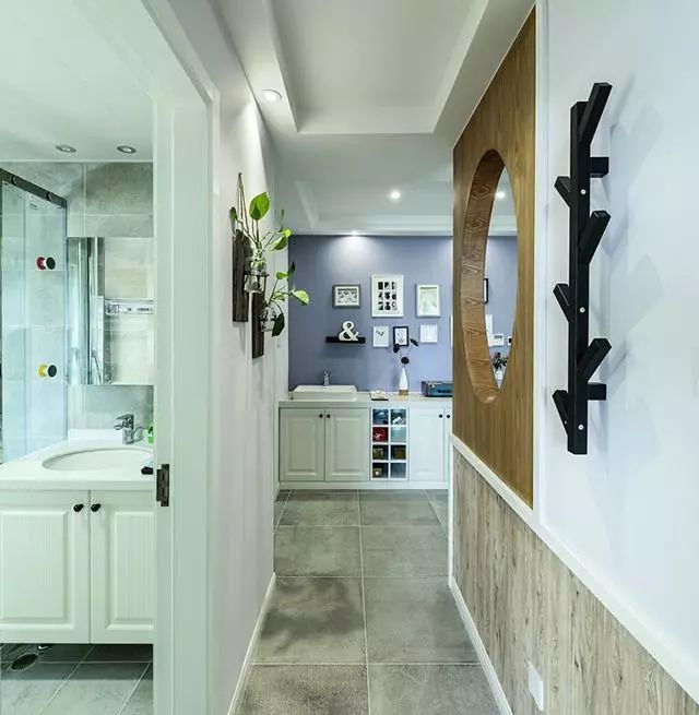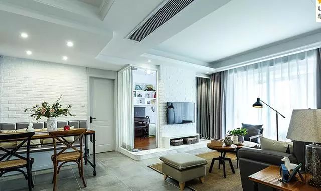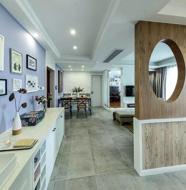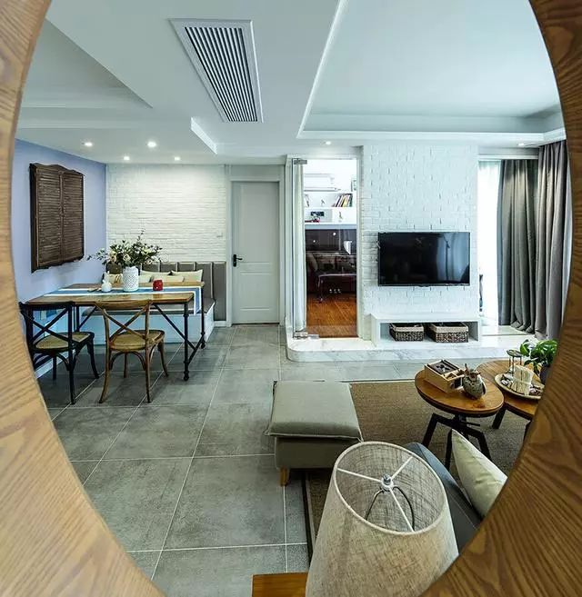 【客厅】北欧清新自然,客厅使用地毯进行分区,很舒适自在。还有一个亮点,就是那个中间圆形镂空的原木色隔断墙。【电视背景墙】文化背景墙后面就是小书房,亮眼的是只有中间部分是文化墙,两边是玻璃,这样让客厅视线更宽更广,很大气不拥挤。【入户门】进门左边是餐厅,右边是厨房和卫生间,卫生间被木质隔断墙给挡住了