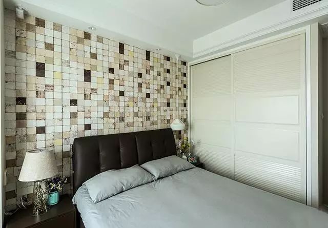 主卧的背景墙面也很好看,马赛克形式的,很有韵味。