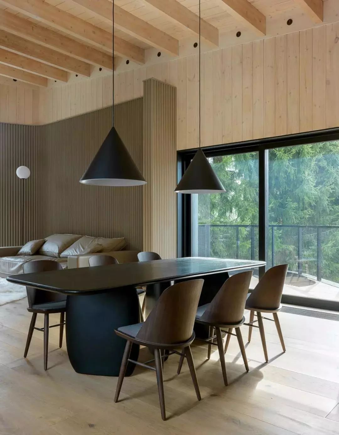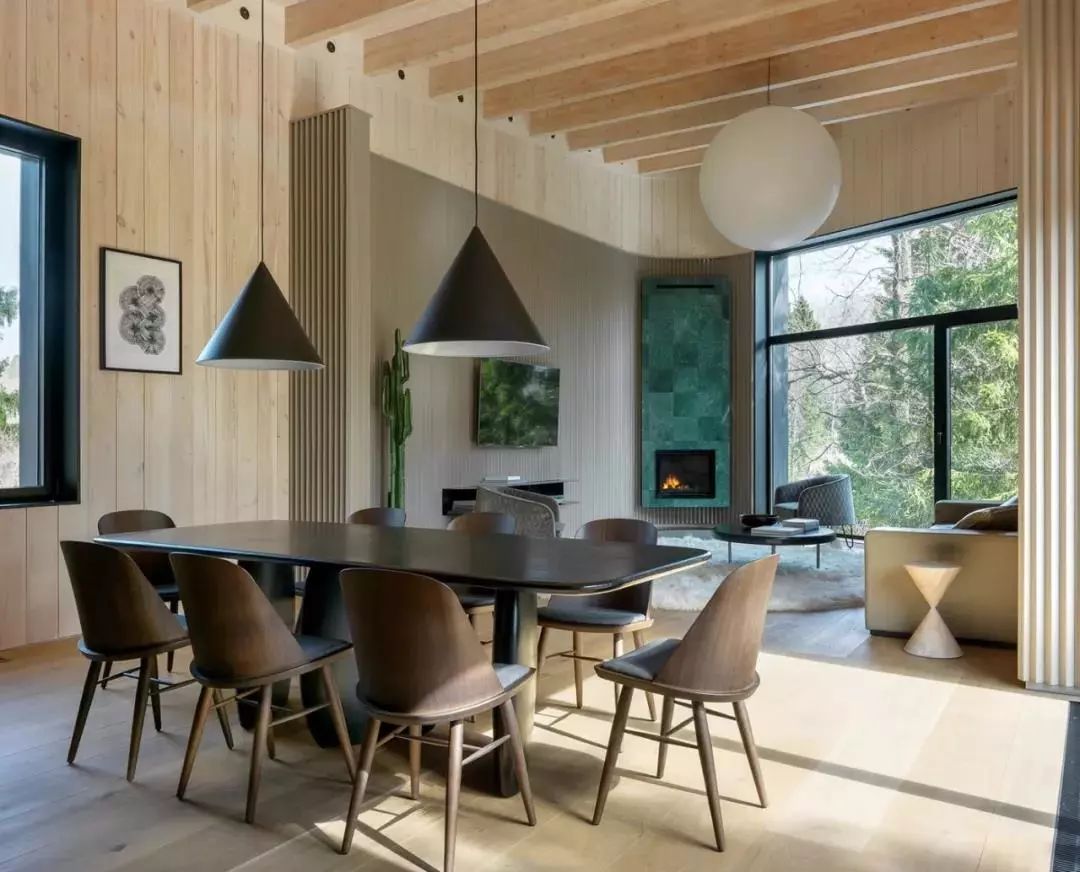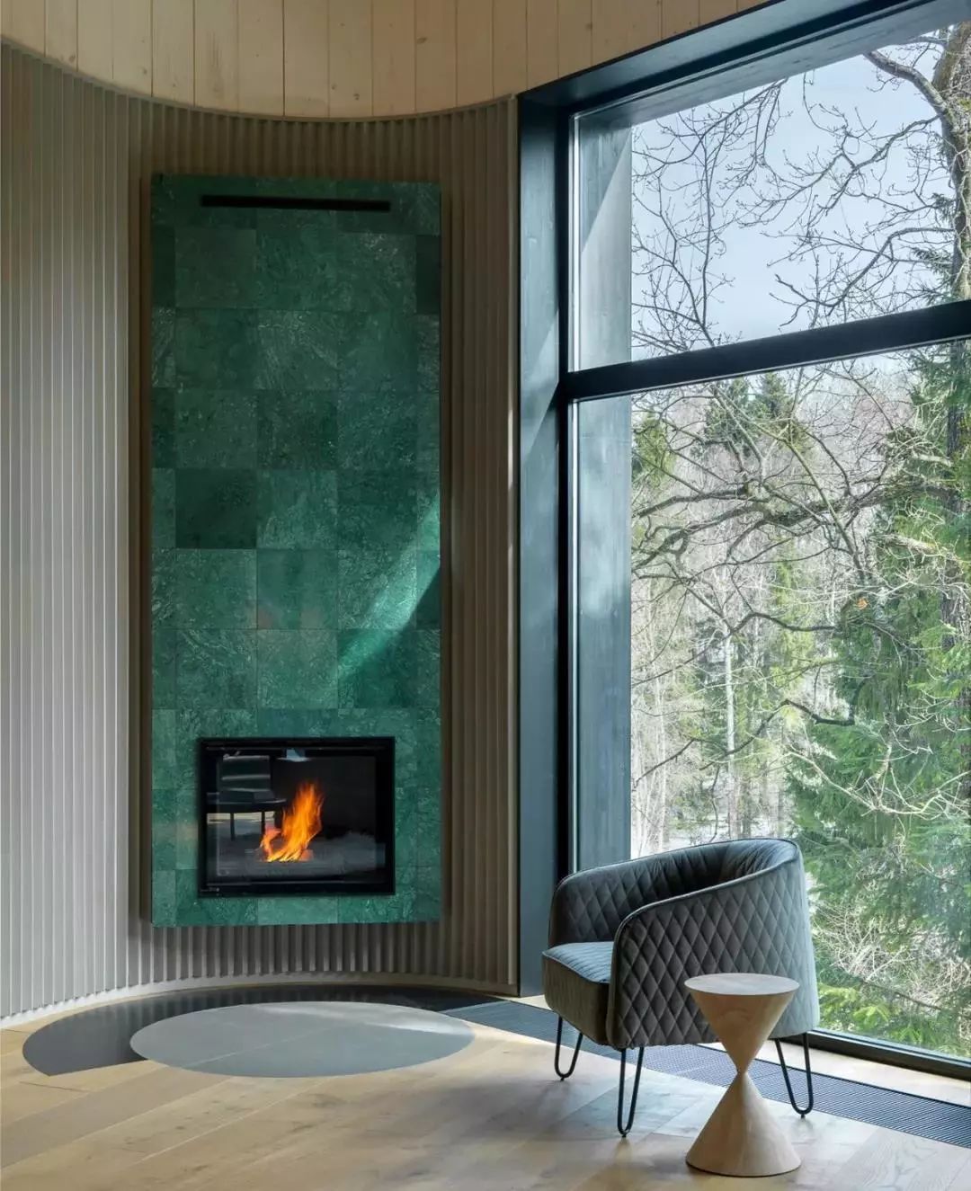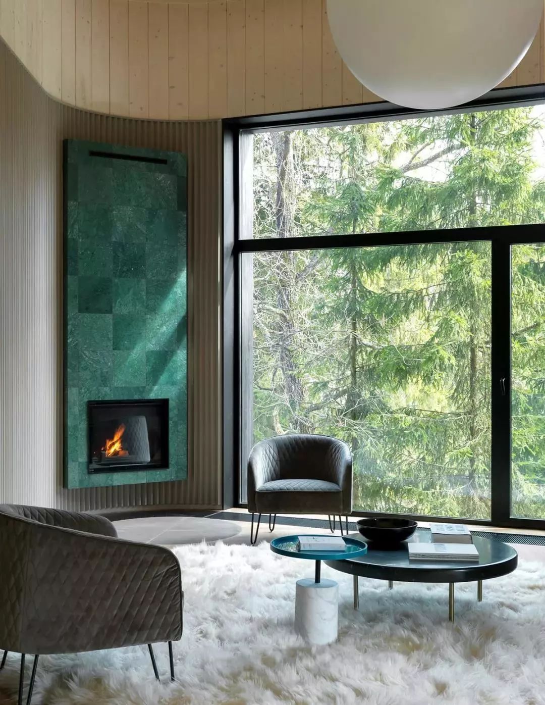 大多数人喜欢原木是因为喜欢它那种不可复制的美感那种岁月留下的痕迹与之相处感觉很舒服这个住宅就是如此客厅大面积的玻璃窗将外面的美景引入室内那郁郁葱葱的绿植颇有一种别样的舒适墙面地板茶几毛地毯各处细节设计都做的非常到位壁炉周围的翡翠绿瓷砖更是点睛之作深浅不一的色彩完美的呼应了户外的绿植色调客厅设计将现