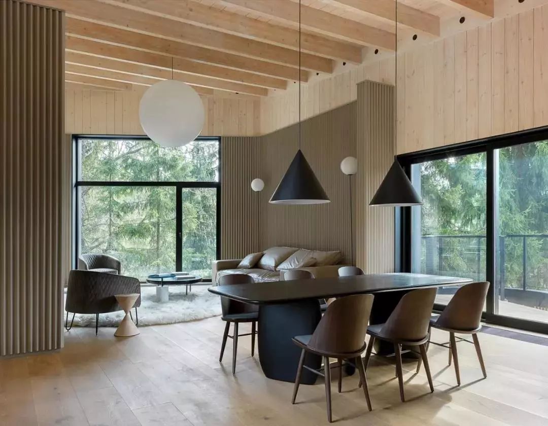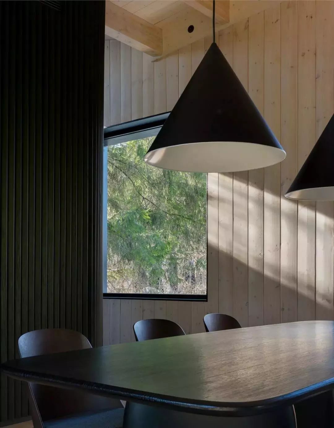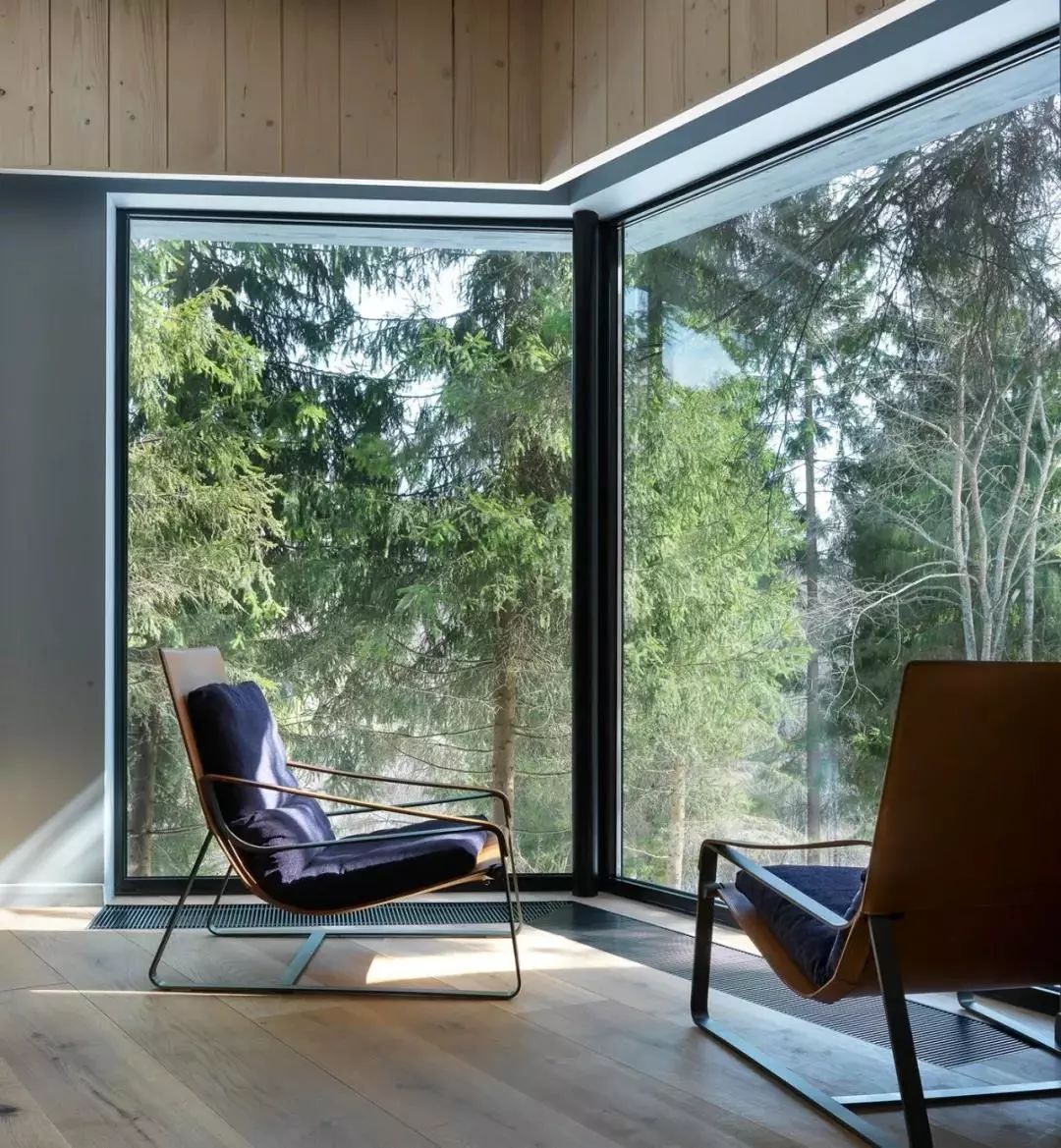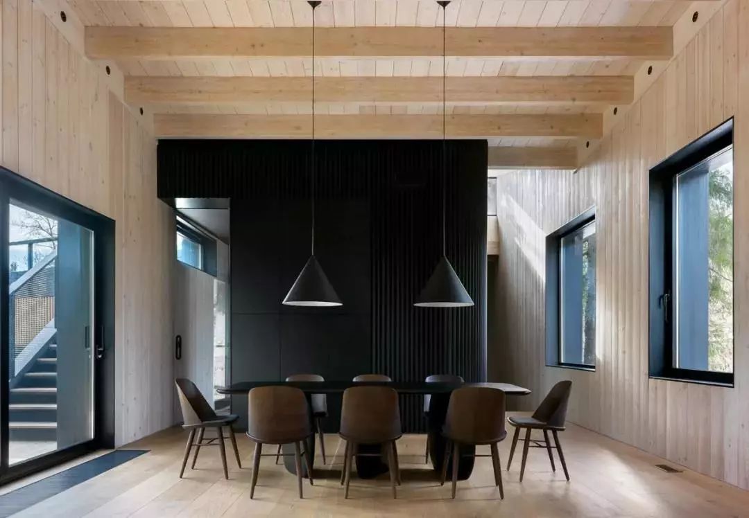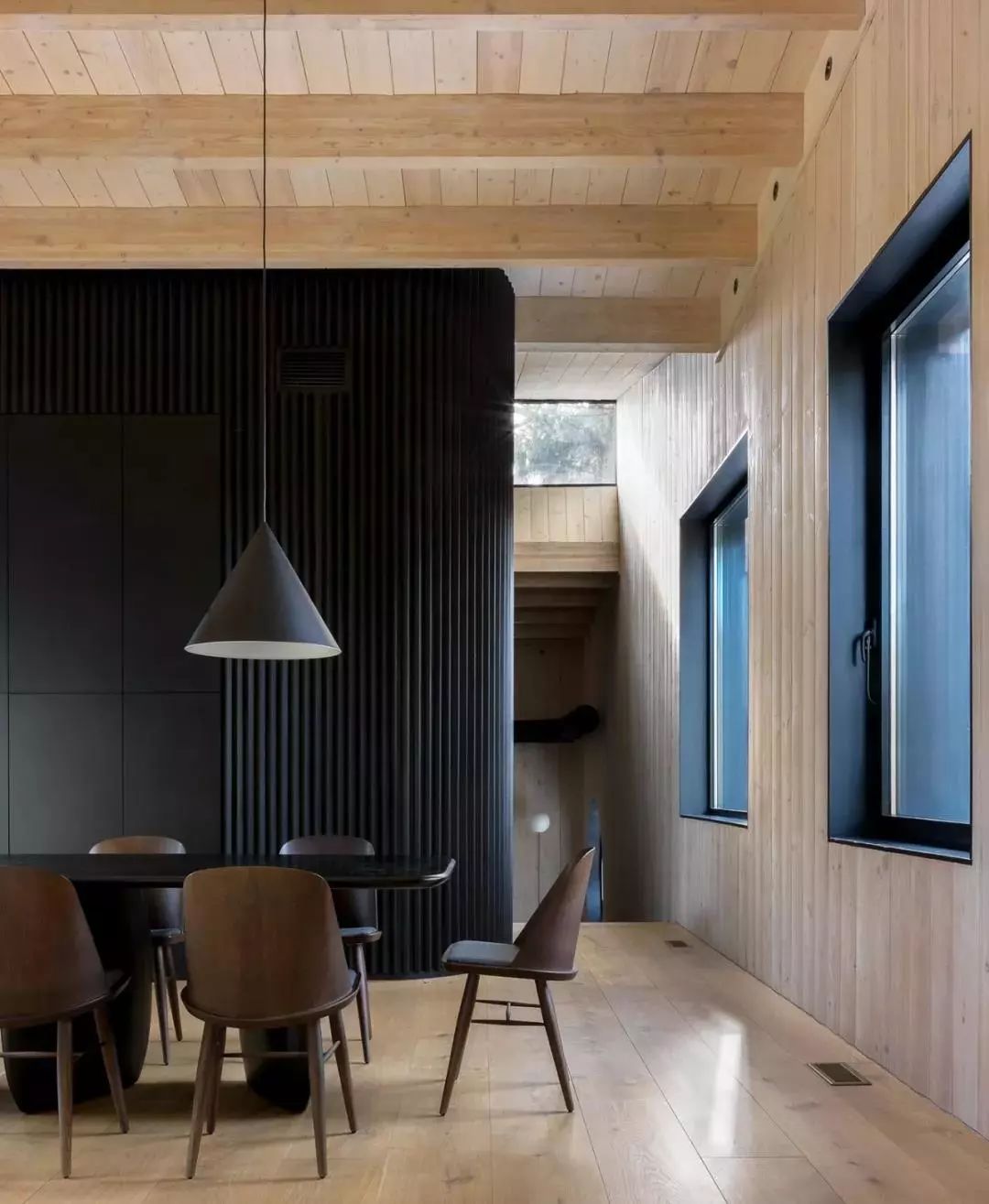 大多数人喜欢原木是因为喜欢它那种不可复制的美感那种岁月留下的痕迹与之相处感觉很舒服这个住宅就是如此客厅大面积的玻璃窗将外面的美景引入室内那郁郁葱葱的绿植颇有一种别样的舒适墙面地板茶几毛地毯各处细节设计都做的非常到位壁炉周围的翡翠绿瓷砖更是点睛之作深浅不一的色彩完美的呼应了户外的绿植色调客厅设计将现