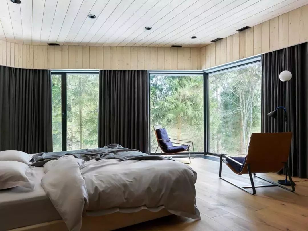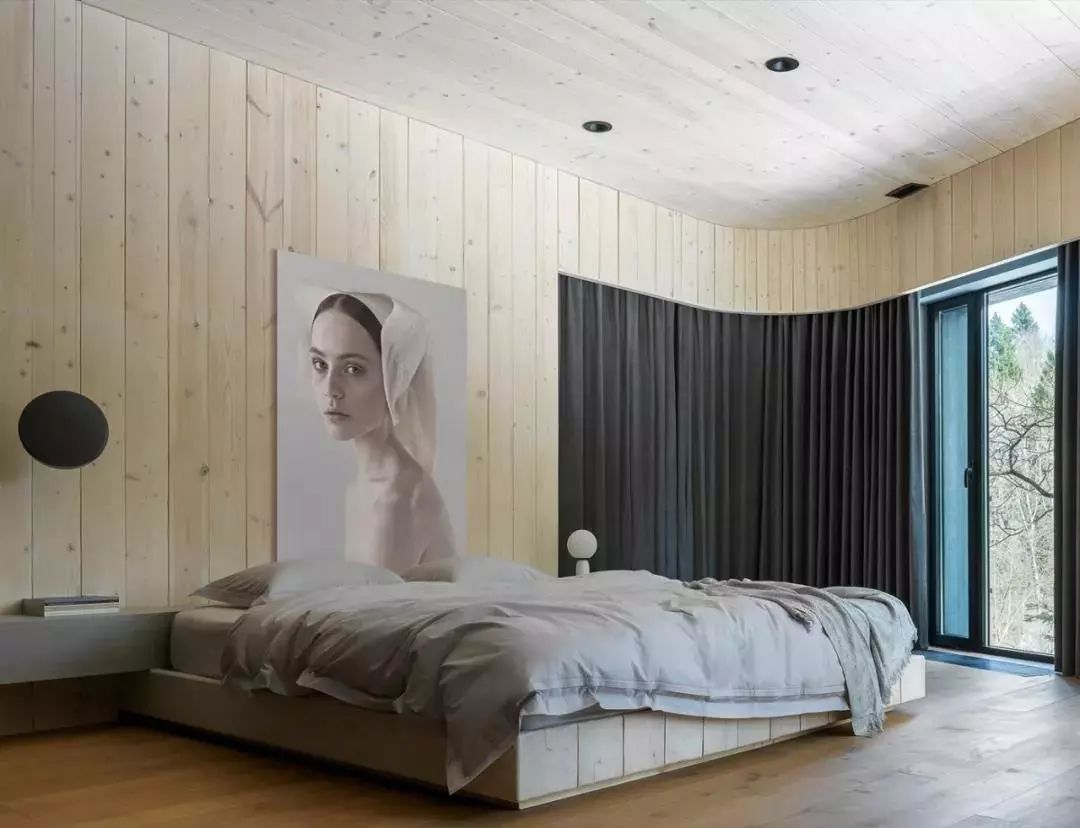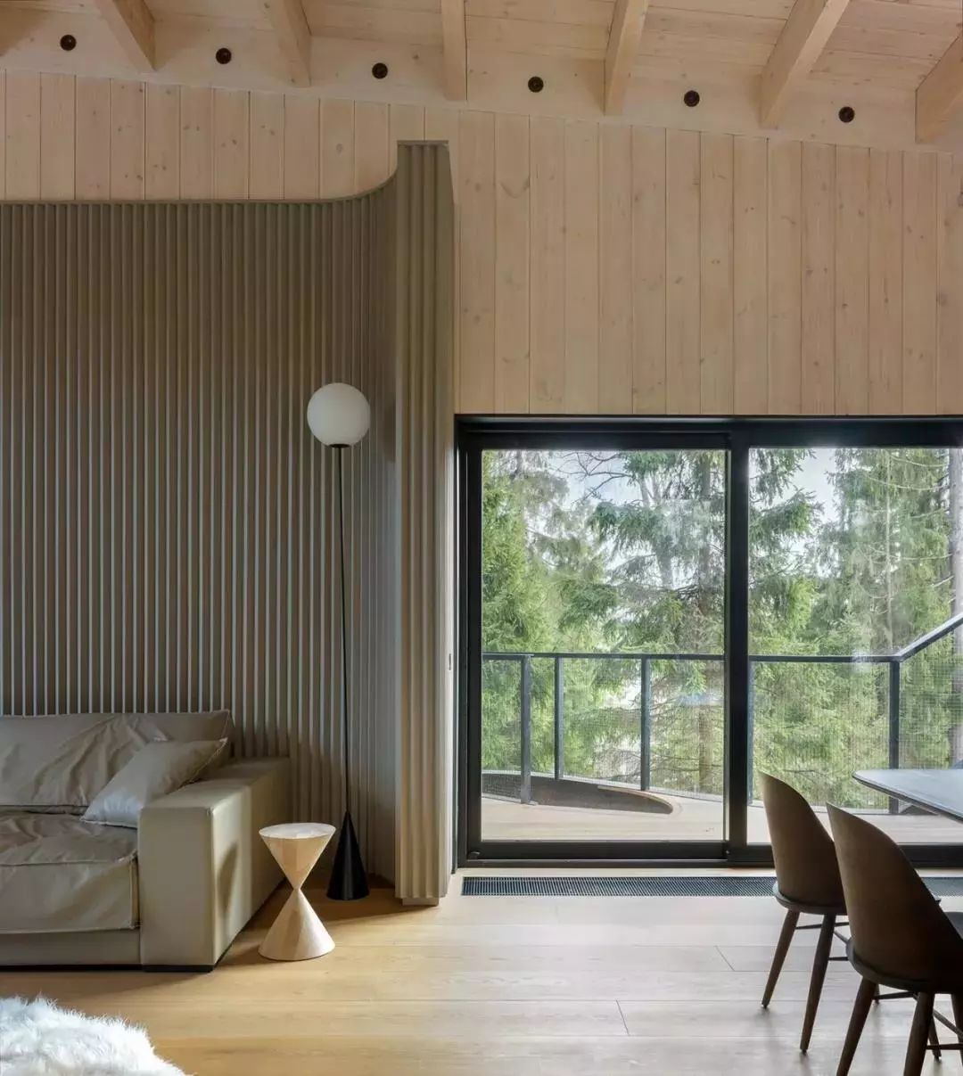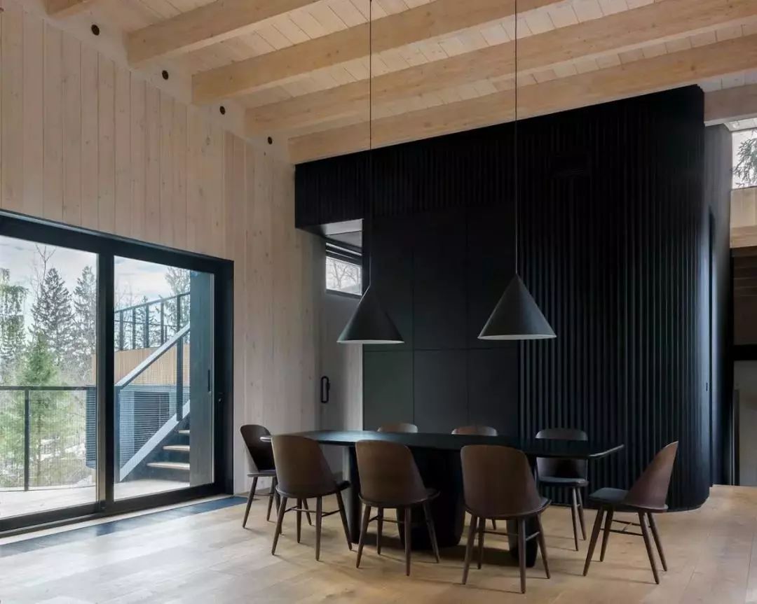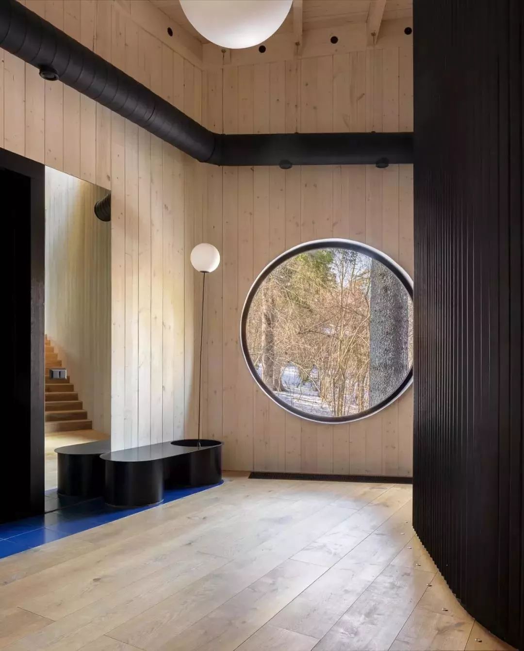 大多数人喜欢原木是因为喜欢它那种不可复制的美感那种岁月留下的痕迹与之相处感觉很舒服这个住宅就是如此客厅大面积的玻璃窗将外面的美景引入室内那郁郁葱葱的绿植颇有一种别样的舒适墙面地板茶几毛地毯各处细节设计都做的非常到位壁炉周围的翡翠绿瓷砖更是点睛之作深浅不一的色彩完美的呼应了户外的绿植色调客厅设计将现