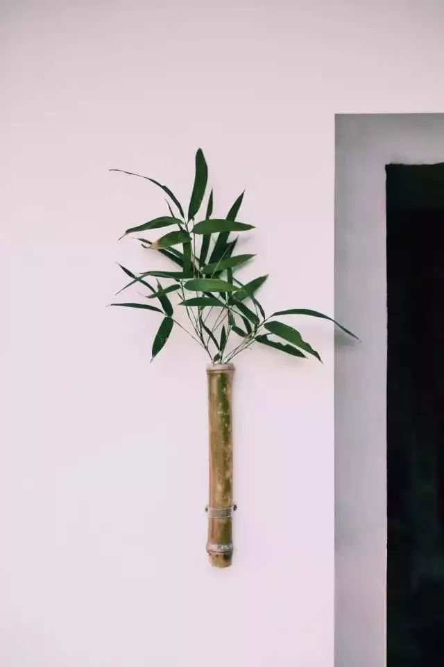 工期收尾后,发现白墙过于单调。于是随手捡起一颗竹子用切割机打磨,就做成了一个容器挂在这里作为装饰,里面随时可蓄水和更换新植物。这一点睛,就让整面墙灵动了起来。