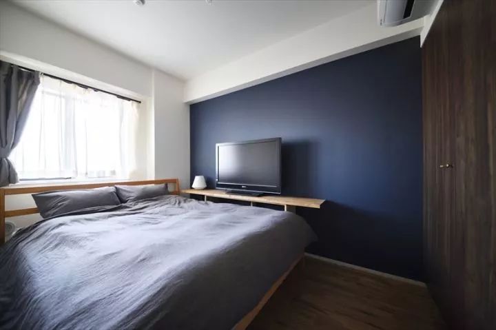 卧室的布置则是另一种氛围,极简沉静,深蓝色墙面给人安心感。