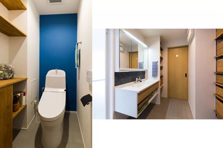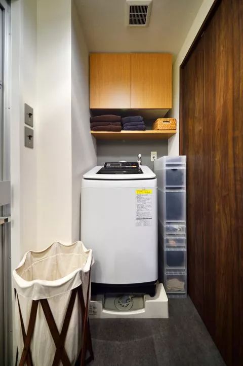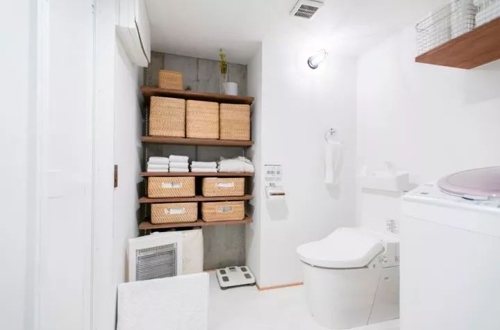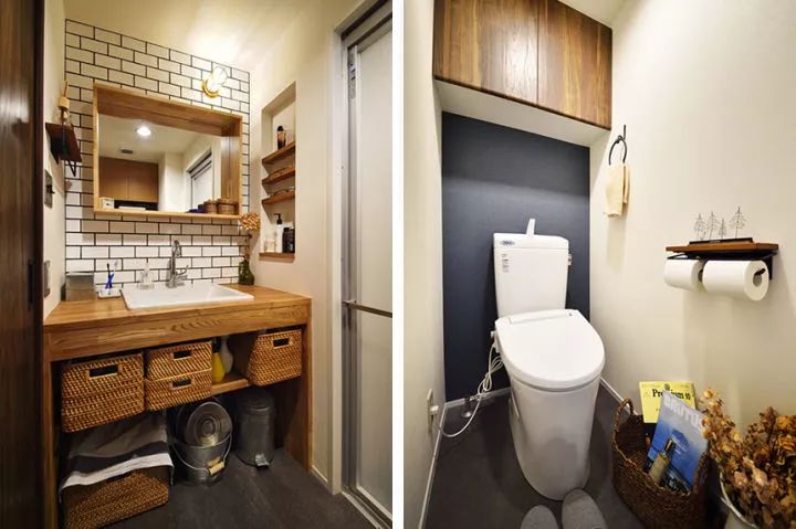 卫生间也是分离式,日本家庭必备,可以看到洗漱区做了非常多的收纳架子,而且都用收纳筐填满,整齐划一。