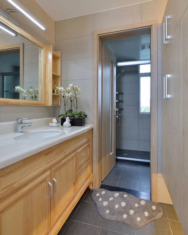如果家中卫生间的面积在5-8㎡,那么做成三分离式也是很宽松的。三式分离卫生间保留了必要的洗漱台、马桶和淋浴,洗漱台外置,在二分离的基础上,使洗漱和如厕也互不干扰。