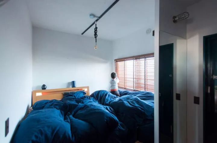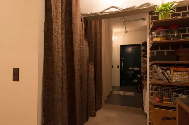 与卧室相连的是一个衣帽间,两个房间都是没有装门,而是用厚实的帘子取代。开放式住宅在日本很常见,通过挂帘隔断空间,轻松方便。