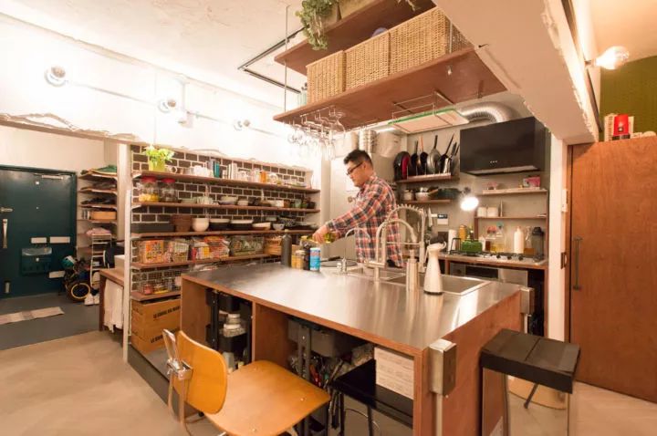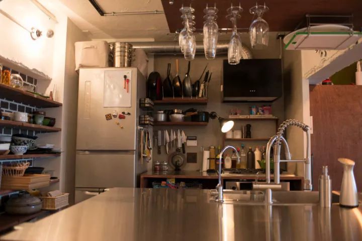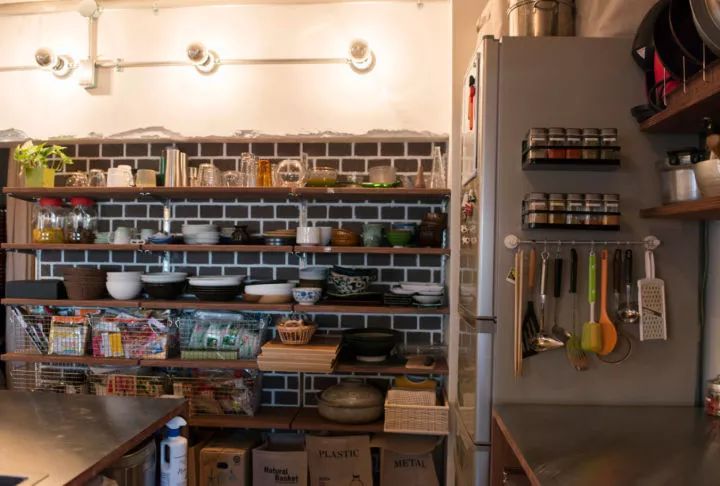 开关门很麻烦,所以收纳尽可能使用开放式。木质和不锈钢材质一结合,看上去就不那么冰冷了。