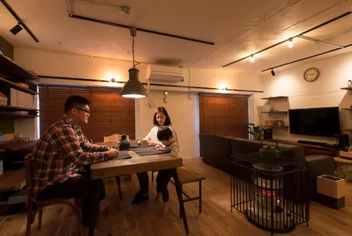 再把目光转向起居室,一家人正其乐融融。这里兼具餐厅和书房,是家庭的核心区。