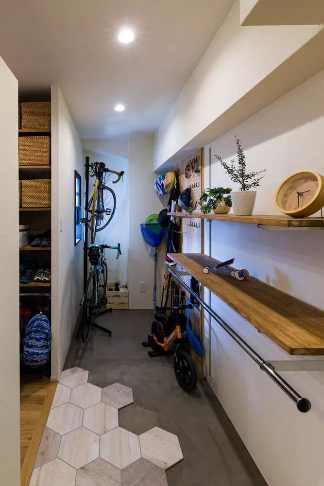 业主热爱骑行,所以玄关用架子挂置了自行车。玄关狭窄,不宜做成带柜门的厚柜子,用开放架能节省空间。