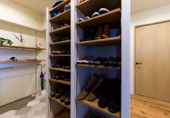 旁边有个开放式的储物区,设计成鞋柜。由于进门不能直接看进这里,所以也不会有凌乱的感觉。