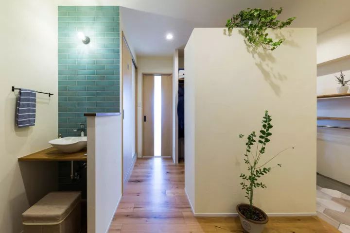 洗手台设在从入口到客厅的走廊角落,让孩子养成回家洗手的习惯。台子的高度尺寸也是根据孩子量身定制。