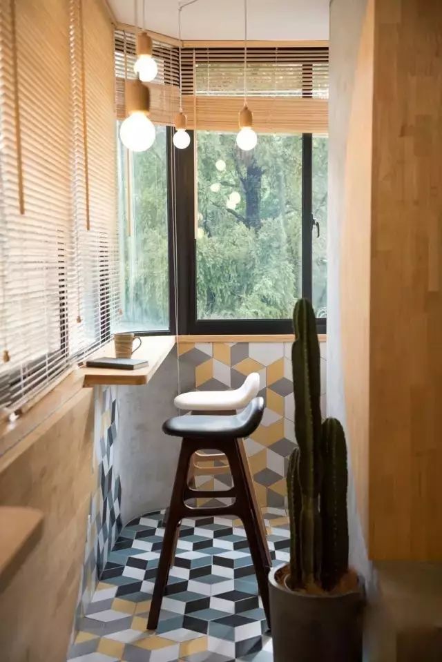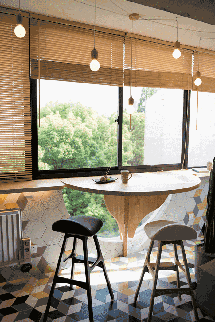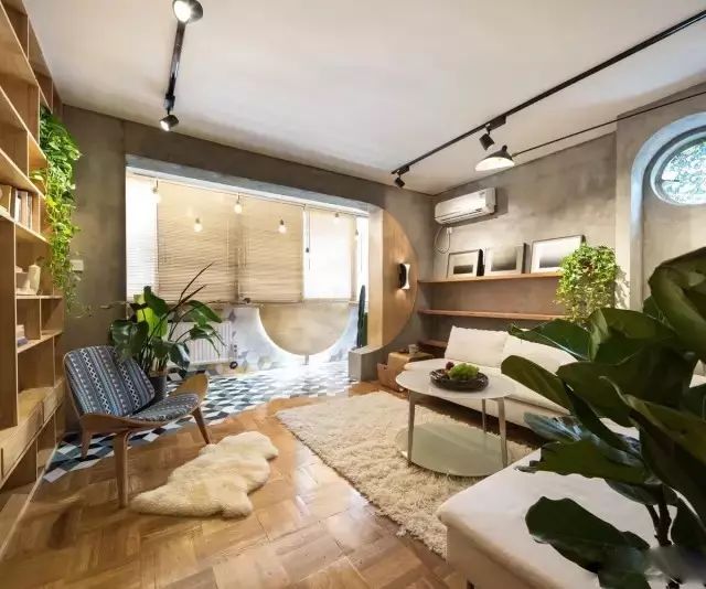 将阳台打通可以最大限度地利用客厅空间,顺着原来就有的半圆窗户,设置了一个活动桌面,抬起来的时候就是一个临床小水吧,放下去的时候可以挡住阳光,像一个装饰墙面。