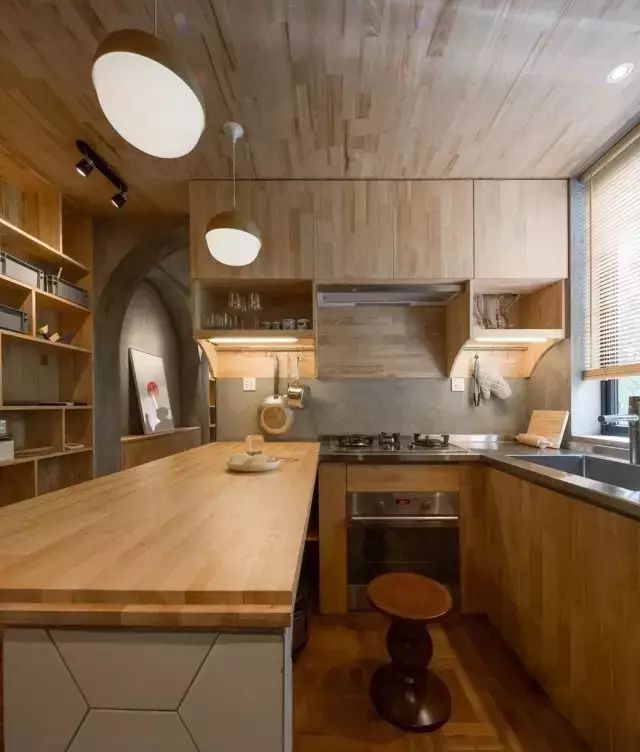 其中一面操作台做成吧台形式,不管是做料理、吃饭、写东西都可以在这里进行;而且不大不小的面积有效聚拢冷气,节约还环保,待在这里当然非常舒服。