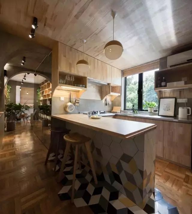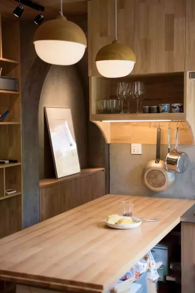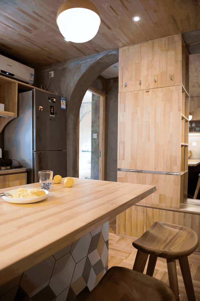 水泥与原木的结合将这个家打造出自然沉静的感觉。又分别在阳台与厨房、卫生间用了一些颜色鲜活的瓷砖来点缀,增强居家感。