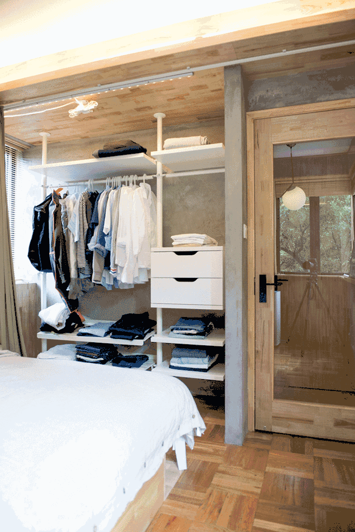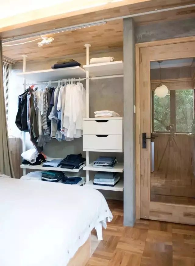在主卧用了敞开式的衣柜,只用帘子隔开,就像衣帽间一样。这样设计一方面缓和了房间过于硬朗的底子;另一方面,打开帘子就可以让北侧窗户的光线透进来。