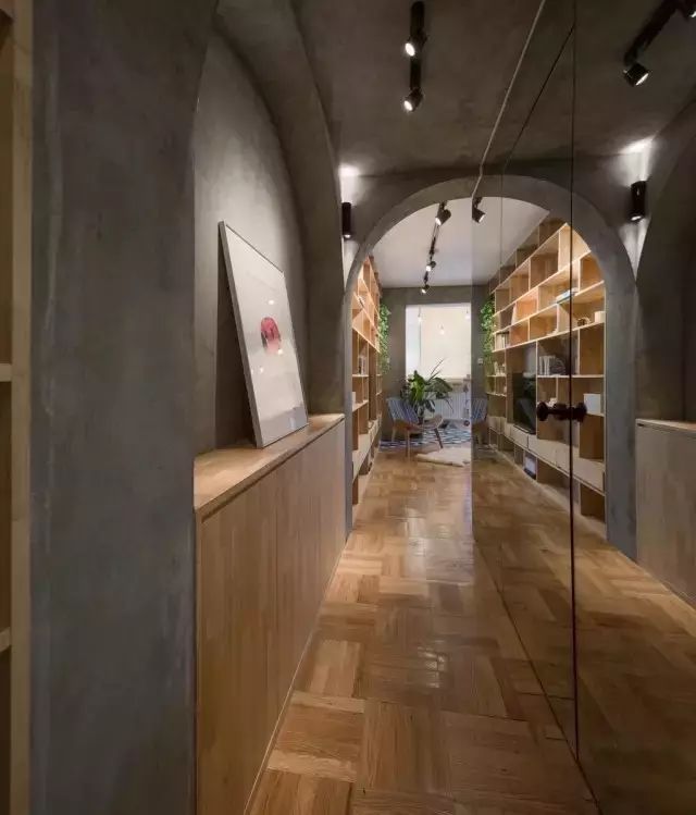 将这个元素延伸下来,是对原有痕迹的一种延续。厨房通往客厅的过道比较窄,用半圆拱结合镜面打造出一个完整的穹顶,从视觉上拓宽了空间,还呼应了其他的圆形元素,让这个家更具设计张力。