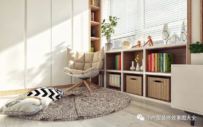 窗边的还是一个休闲的小角落,一个沙发椅,地上的针织的地毯,还有几个抱枕,可以再阳光下晒晒太阳,看看书。
