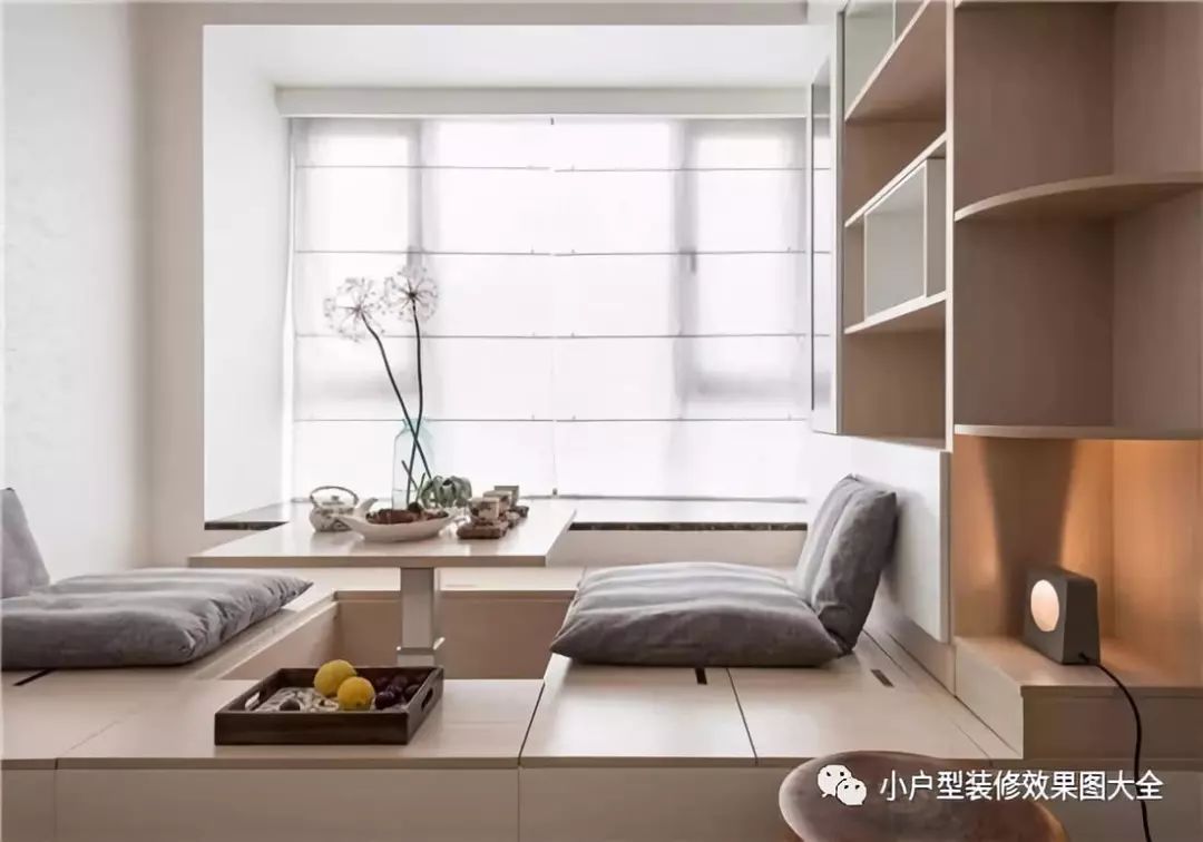 侧卧则是没有装修成传统的客房,而是打造成了榻榻米样式的休闲空间,榻榻米的中间的小桌子还是一个可以收缩的,更好地节省了空间,在这样的一个带有放松气息和禅意的房间了,没事的时候可以邀上三五好友来这里品茶休闲一下。