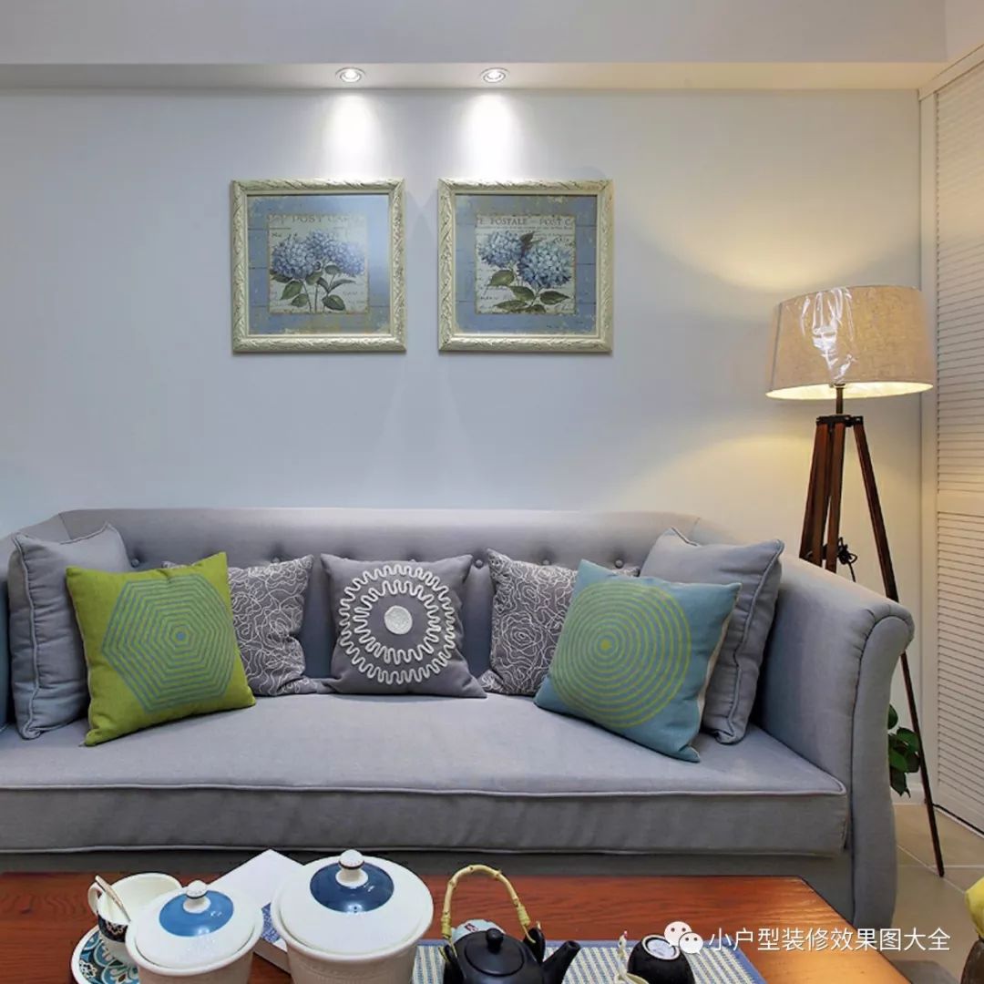 沙发的背景墙上两幅淡雅的画作在小灯的装饰下,还有旁边的暖黄色台灯,是不是很有氛围?